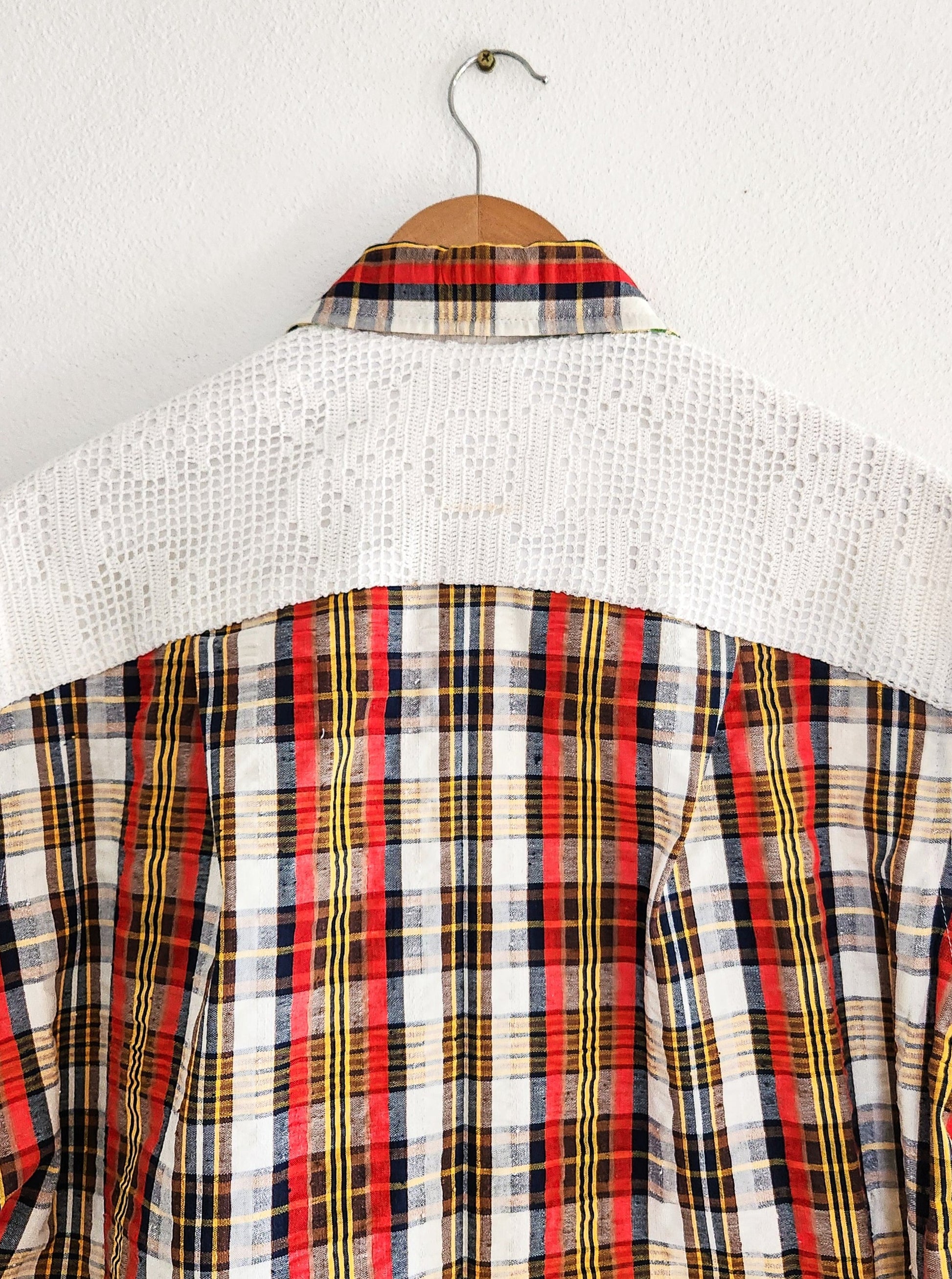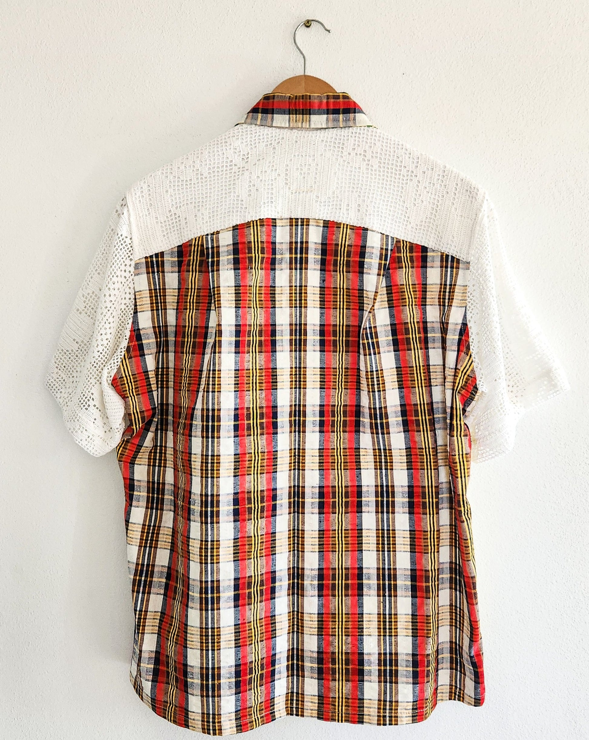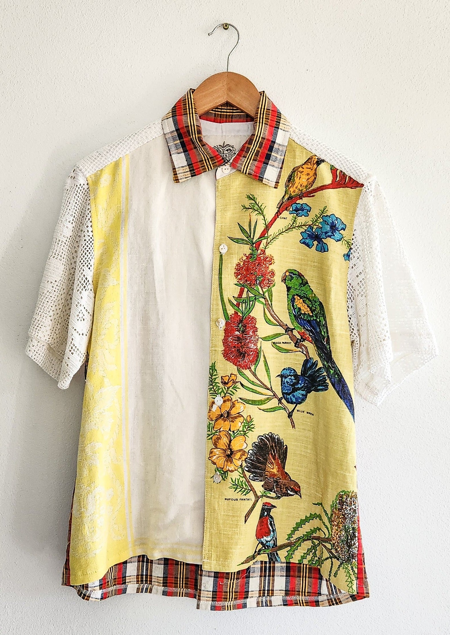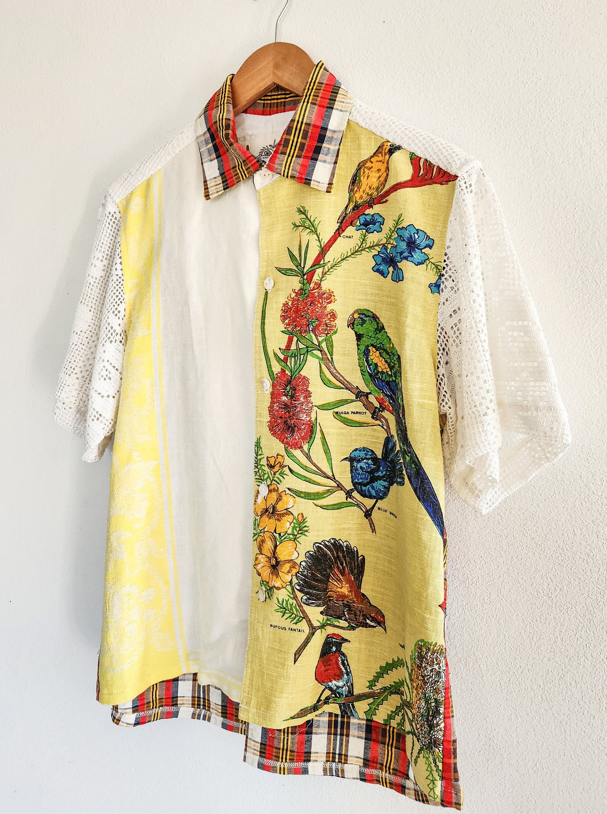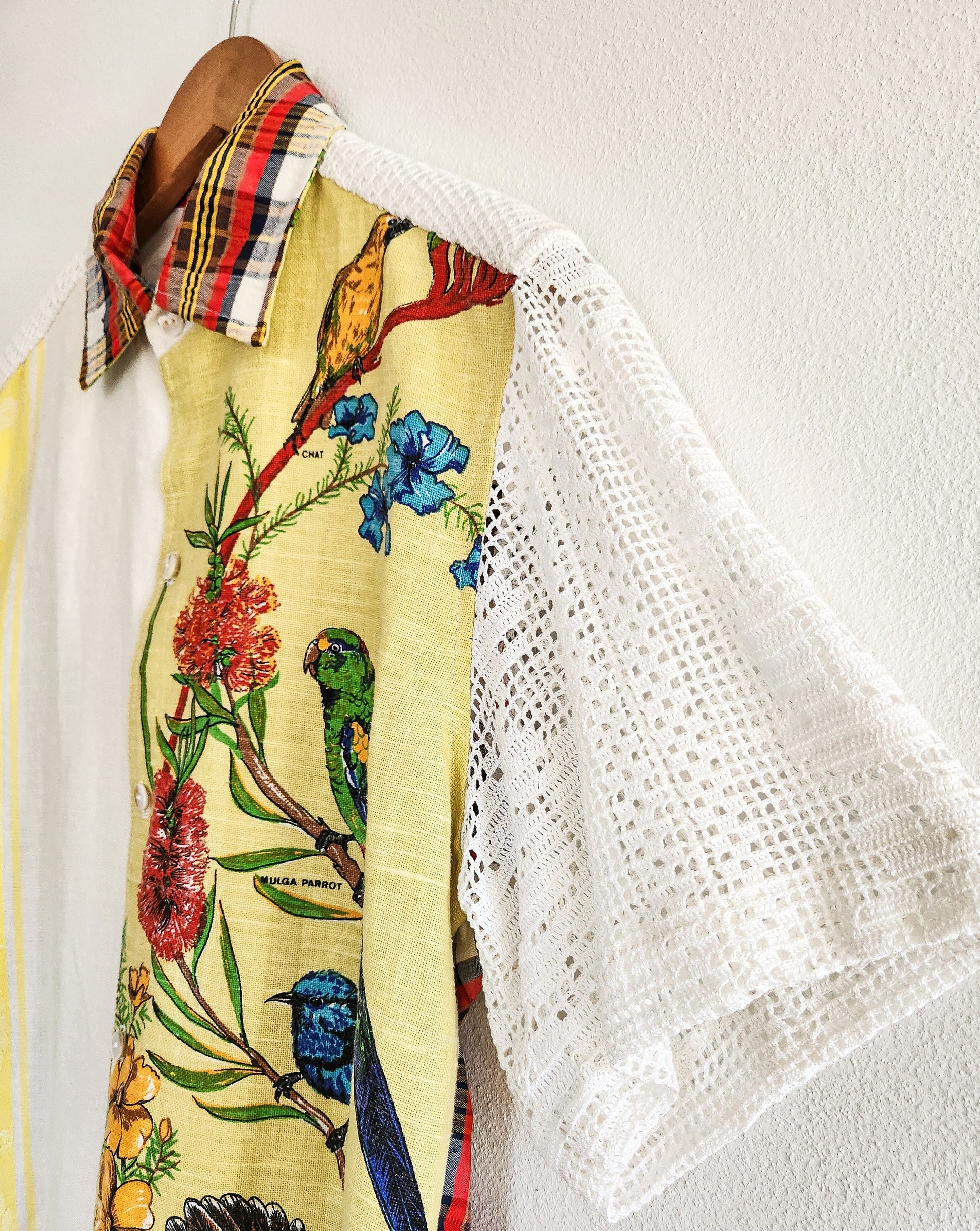 This sweet shirt is made from a delicious mix of vintage fabrics. A seersucker tartan cotton, a yellow brocade tea towel, crocheted rose fabric and an Australian Parrot souvenir tea towel.🧵