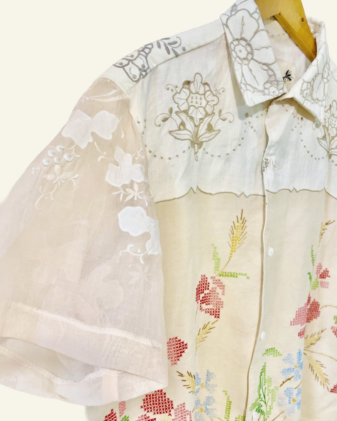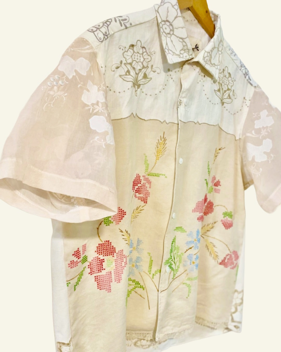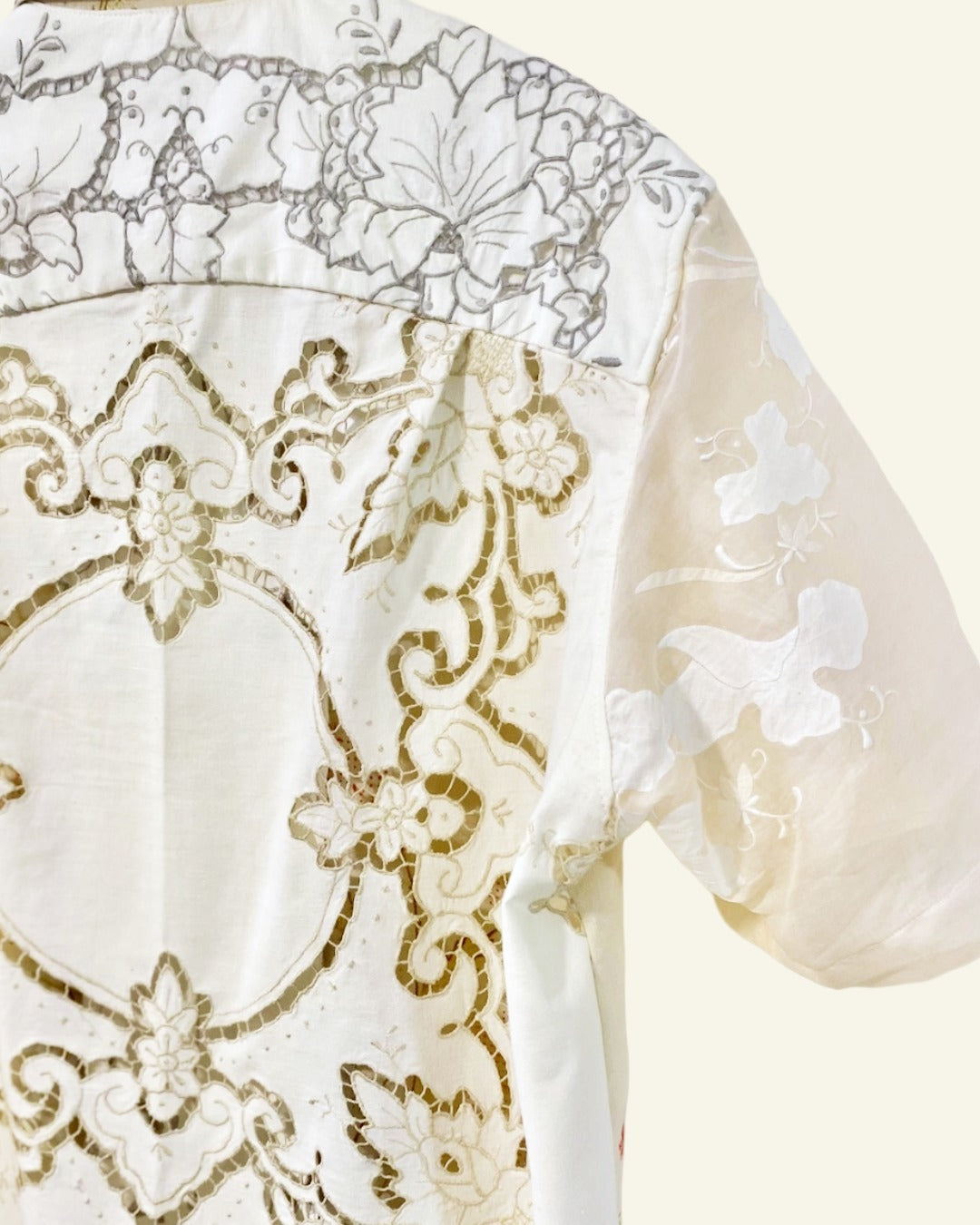 The Remember Me shirt is an individually handcrafted unisex piece. This shirt is made from a collection of vintage repurposed table cloths.