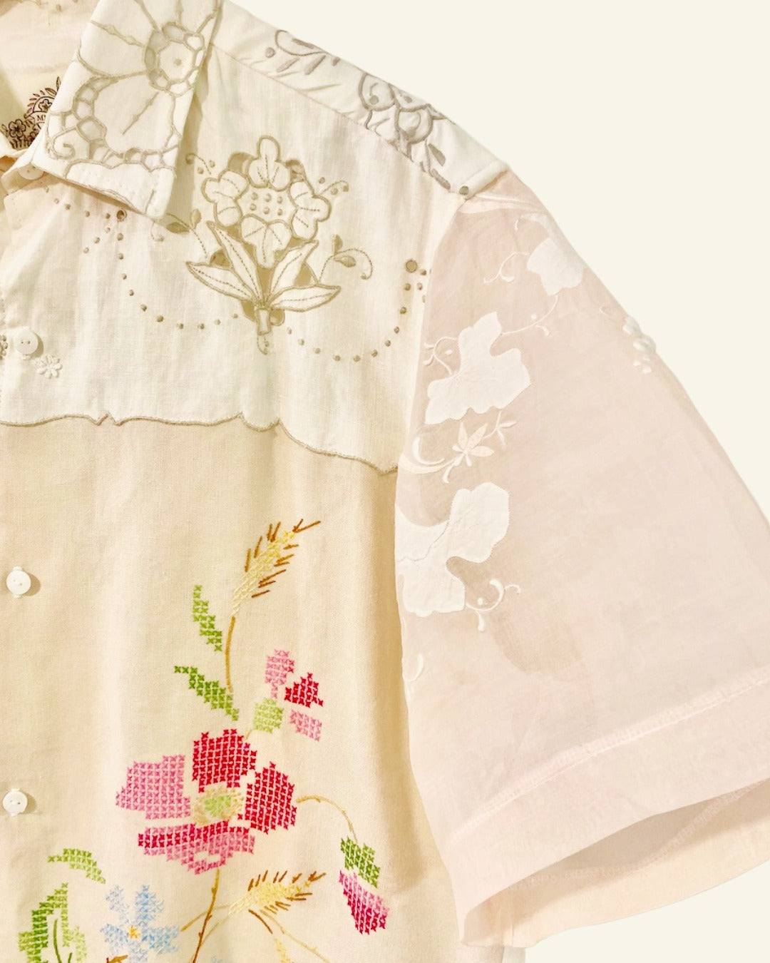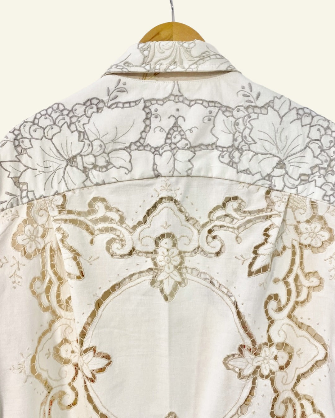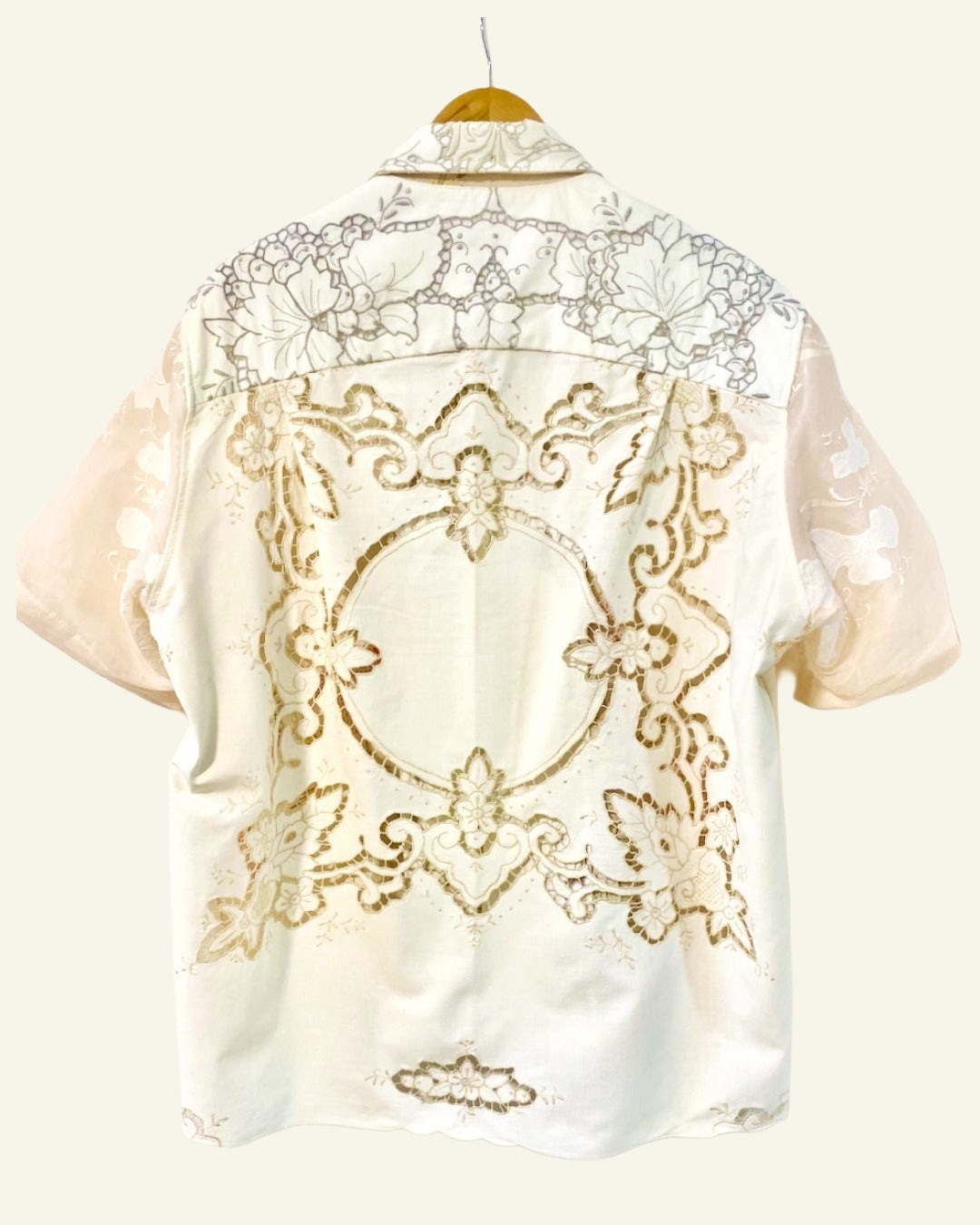 The Remember Me shirt is an individually handcrafted unisex piece. This shirt is made from a collection of vintage repurposed table cloths.