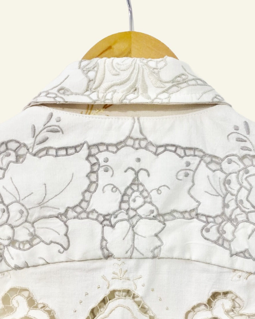 🧵A transparent cotton organdie in pale apricot with white applique and embroider.
