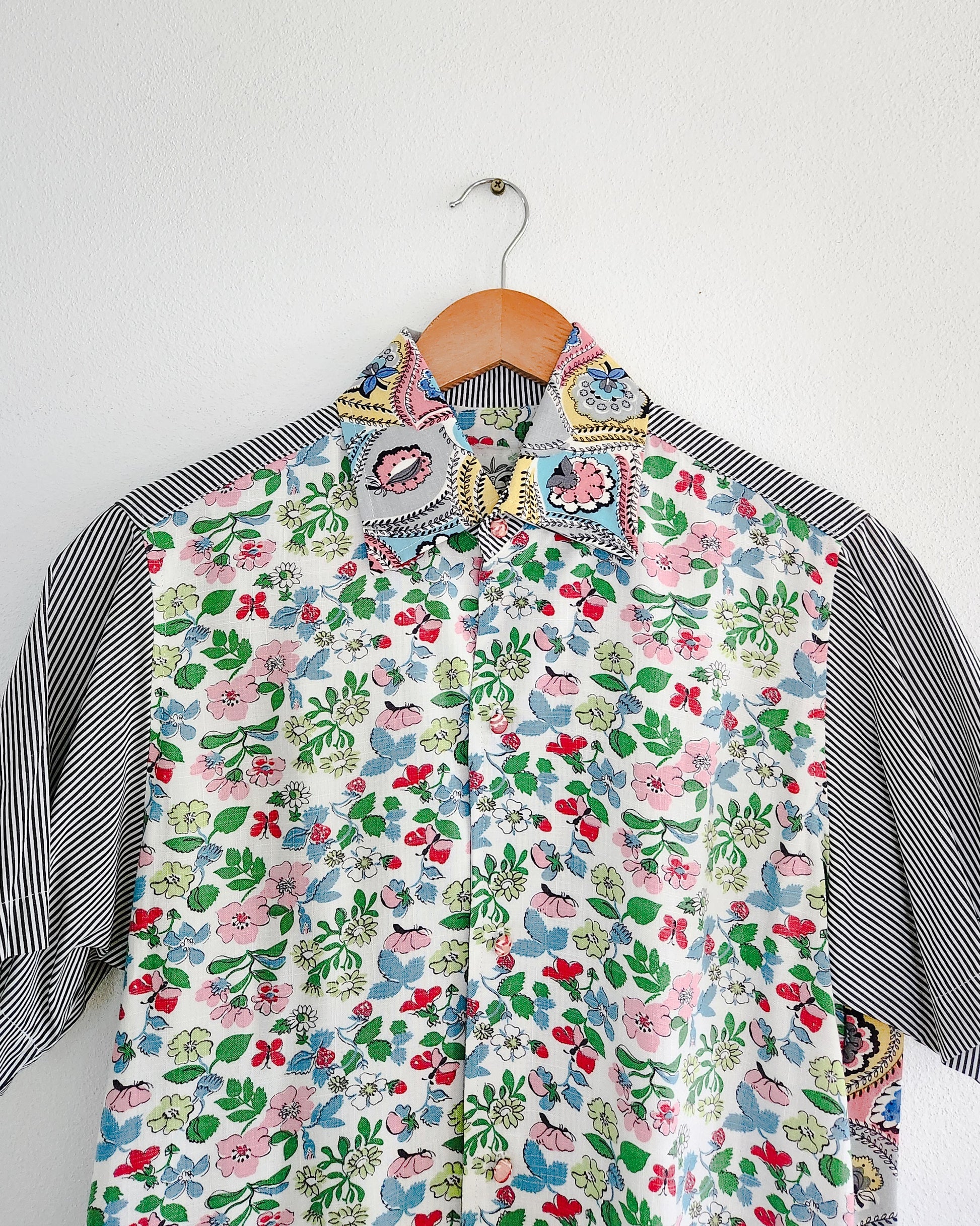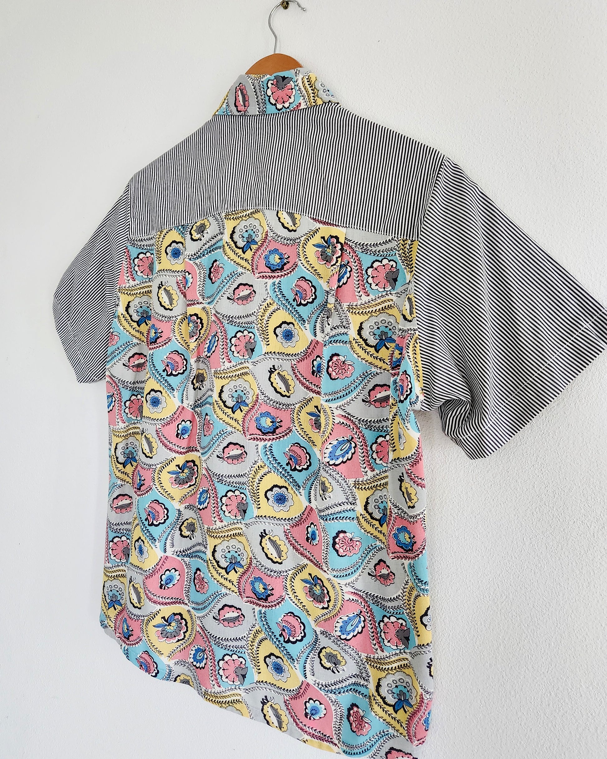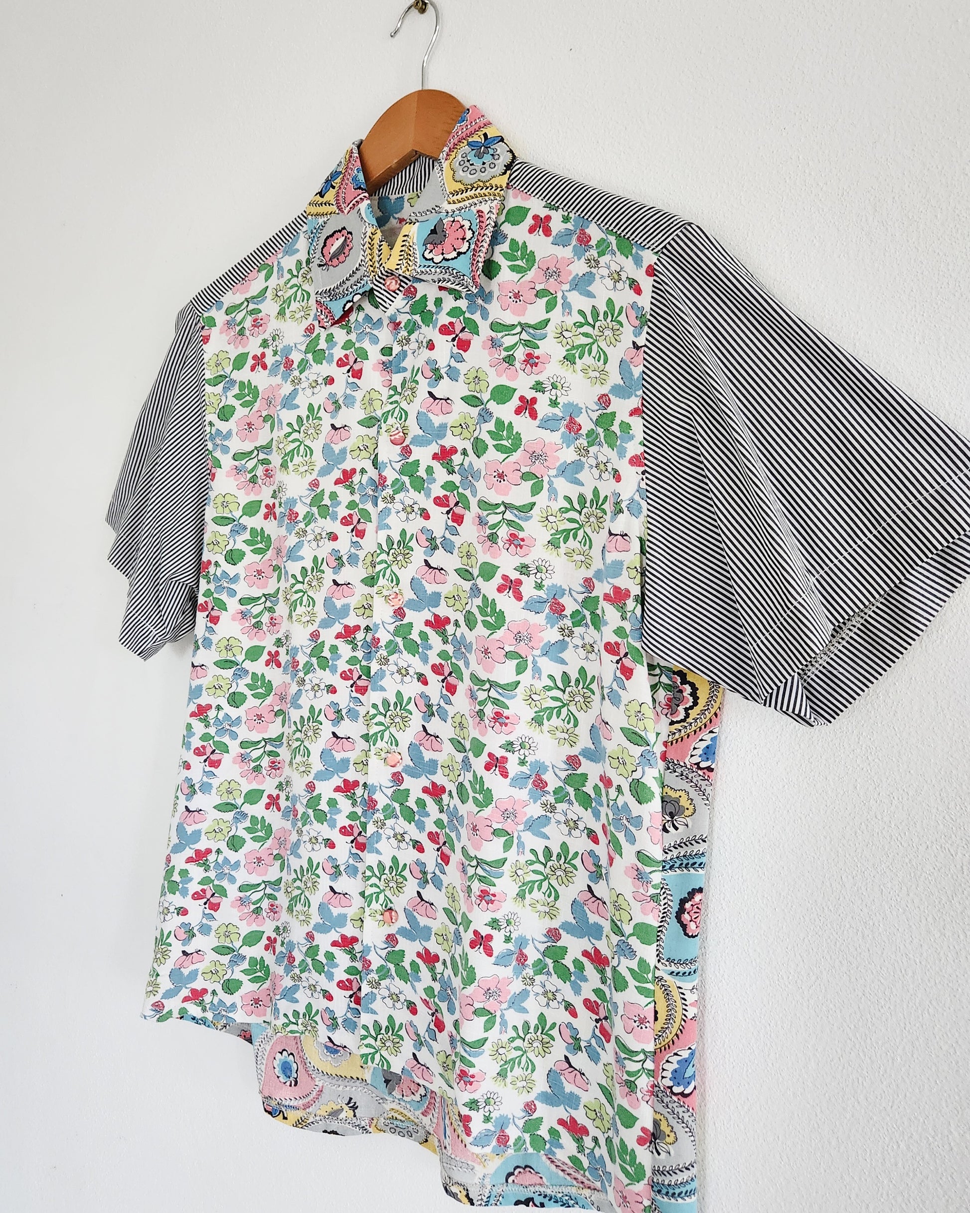 This shirt is made from two very beautiful vintage (c1950's) floral cotton rayon fabrics teamed with a crisp black and white striped cotton. 🧵
