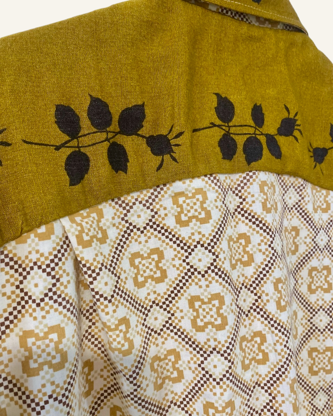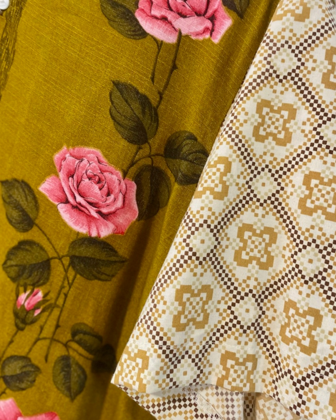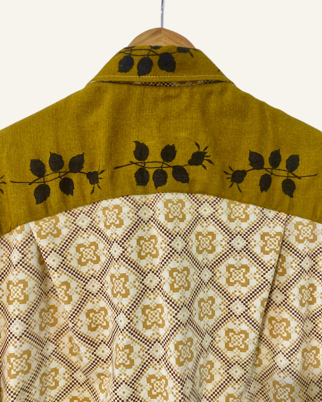 This shirt is made from a sienna brown rayon supper cloth featuring rows of bright pink roses and teamed with a soft cotton geometric printed fabric in brown and beige hues.