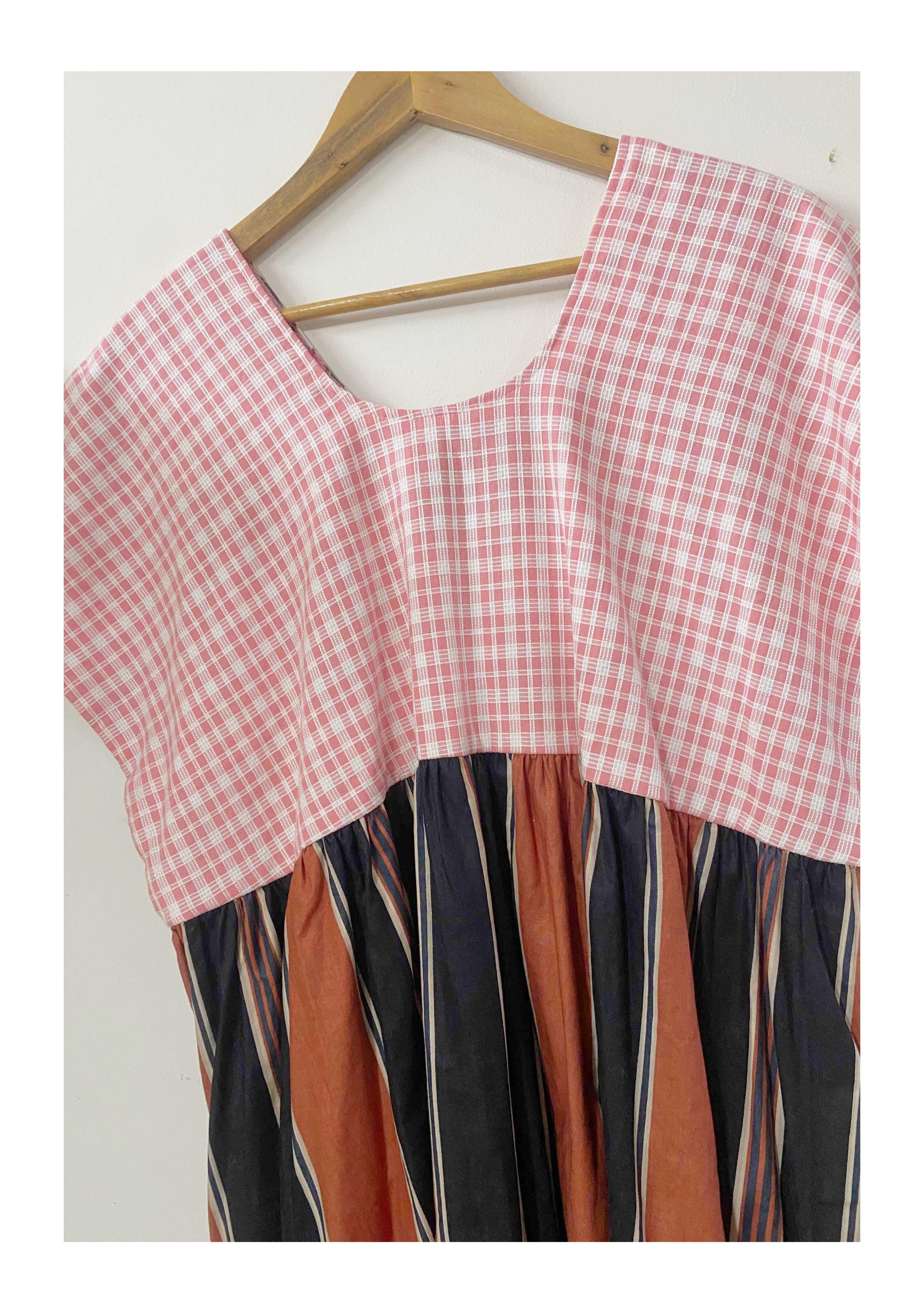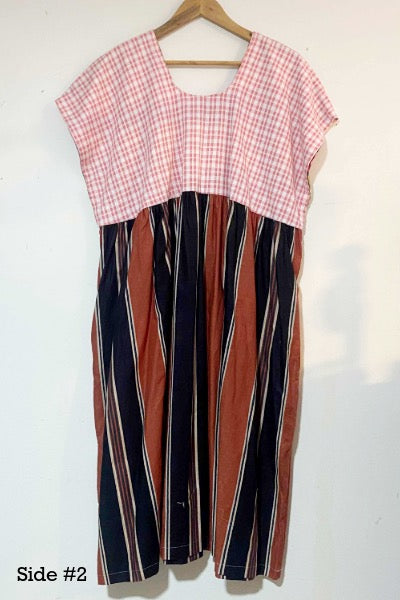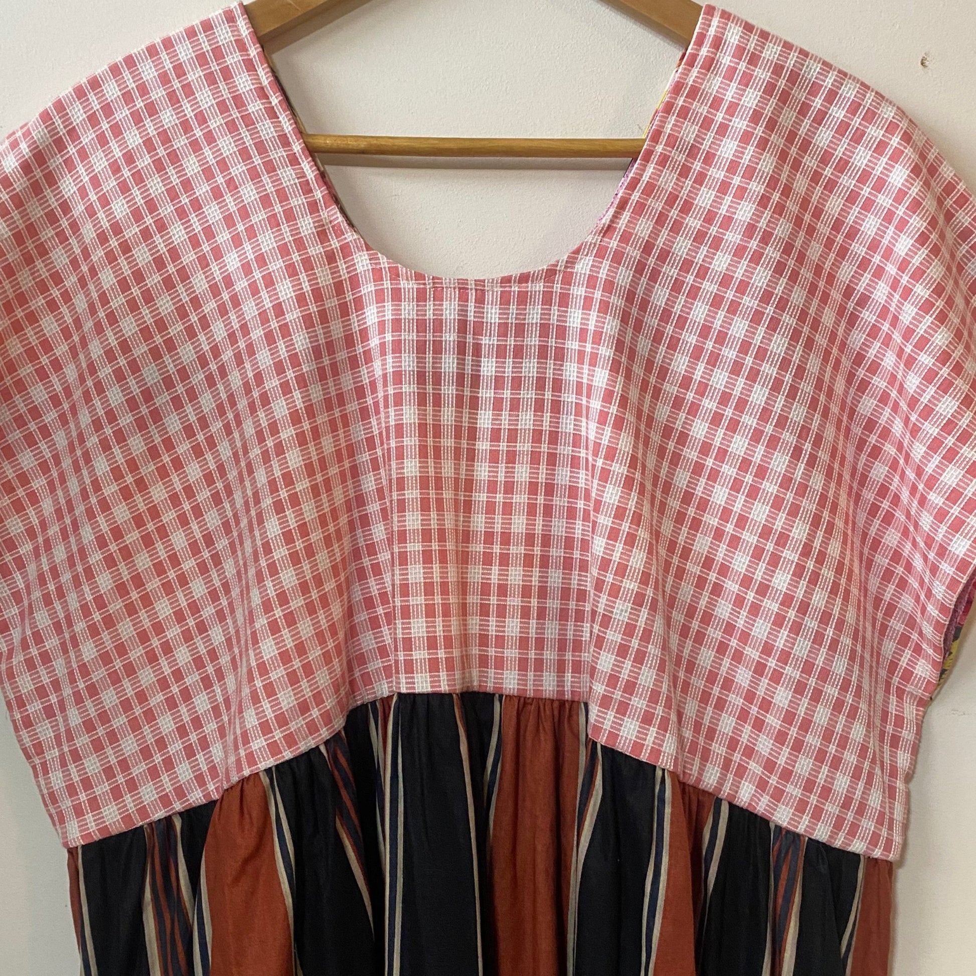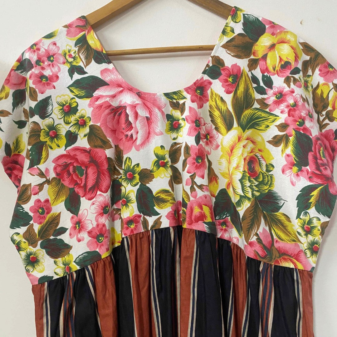 The Eloise smock dress, made from a combination of vintage cotton fabrics that include pink gingham, rust brown, white and black bold stripe polished cotton, and a vibrant floral print. It will make a bold and eye-catching statement and you will feel confident and beautiful, turning heads wherever you go. Don't miss out on this must-have addition to your wardrobe!
