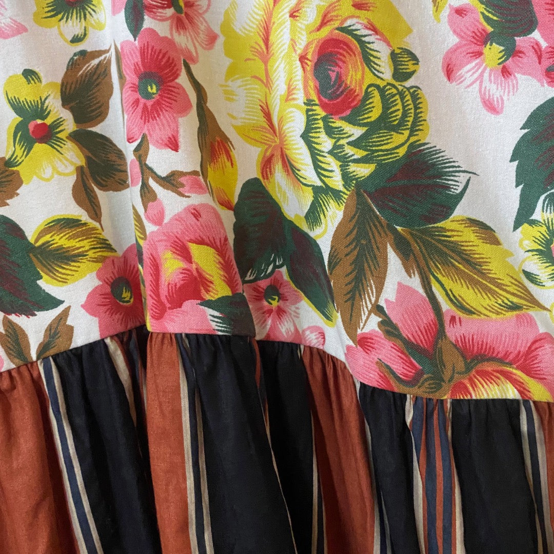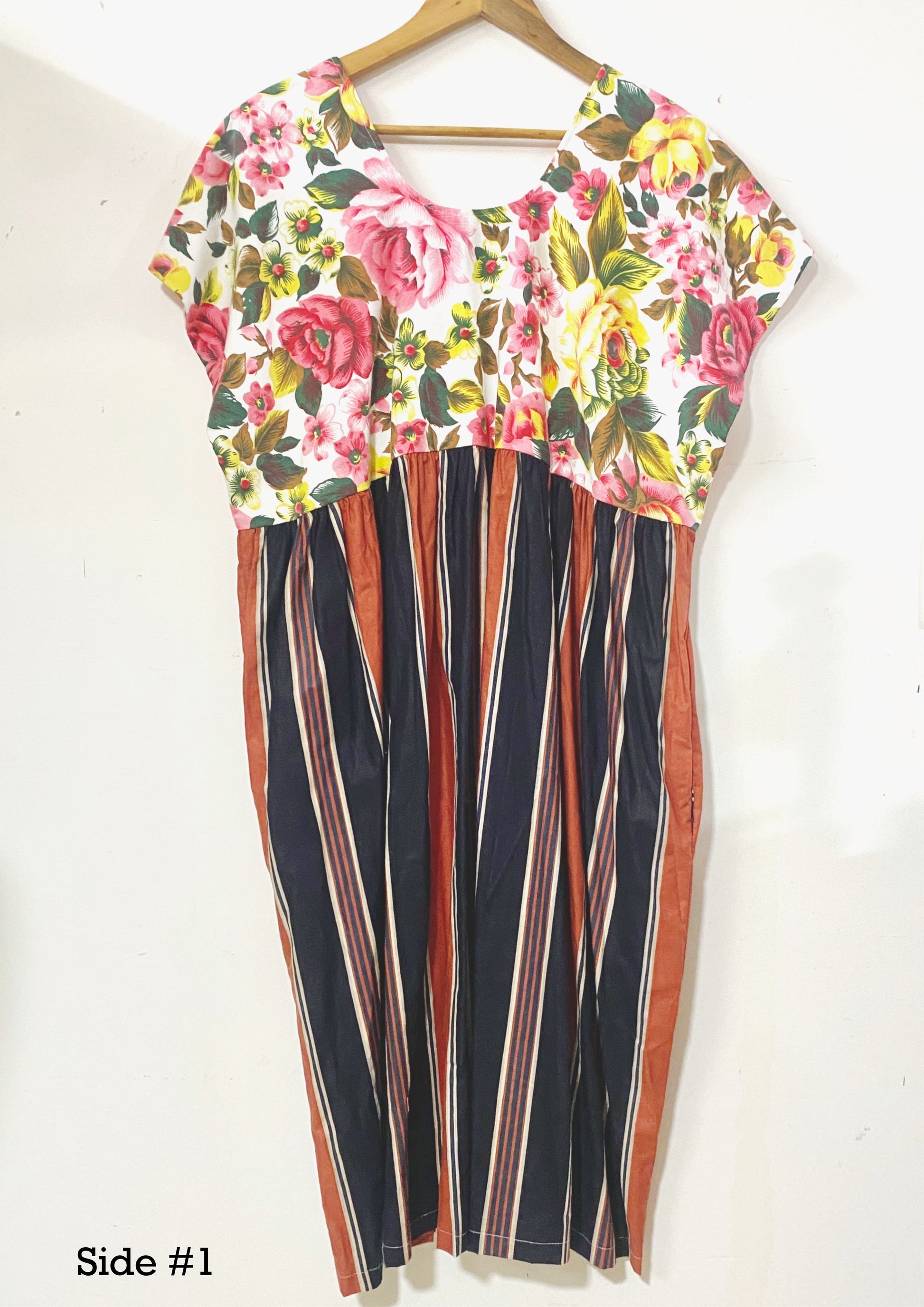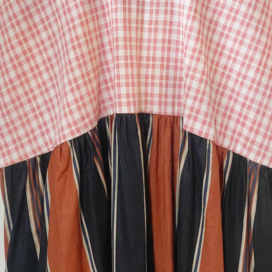 The Eloise smock dress, made from a combination of vintage cotton fabrics that include pink gingham, rust brown, white and black bold stripe polished cotton, and a vibrant floral print. It will make a bold and eye-catching statement and you will feel confident and beautiful, turning heads wherever you go. Don't miss out on this must-have addition to your wardrobe!