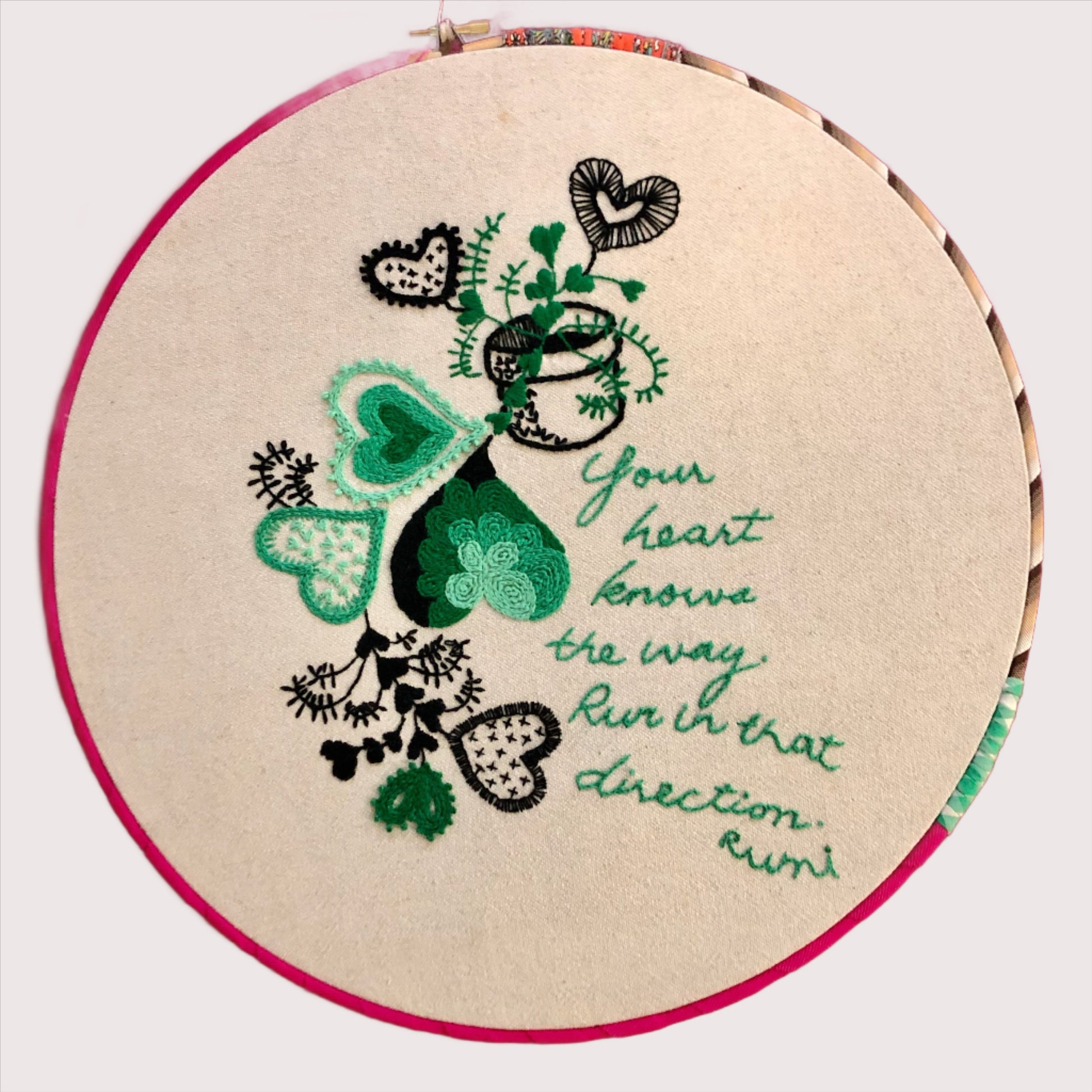 The Follow Your Heart Vine embroidery design is a little reminder that your heart knows the way and is inspired by Rumi inspirational quotes and poems and my need to grow plants and make stuff.