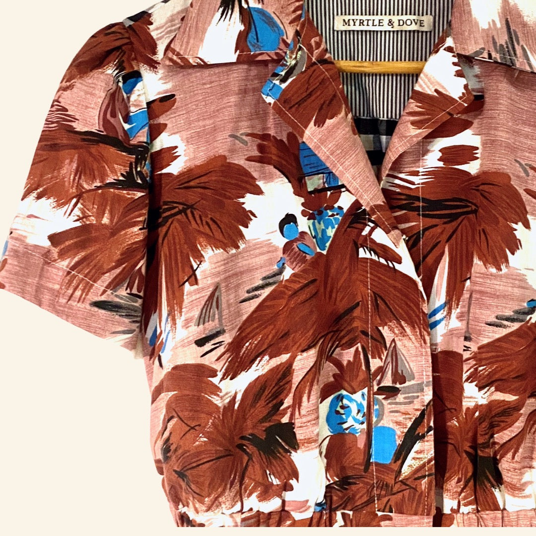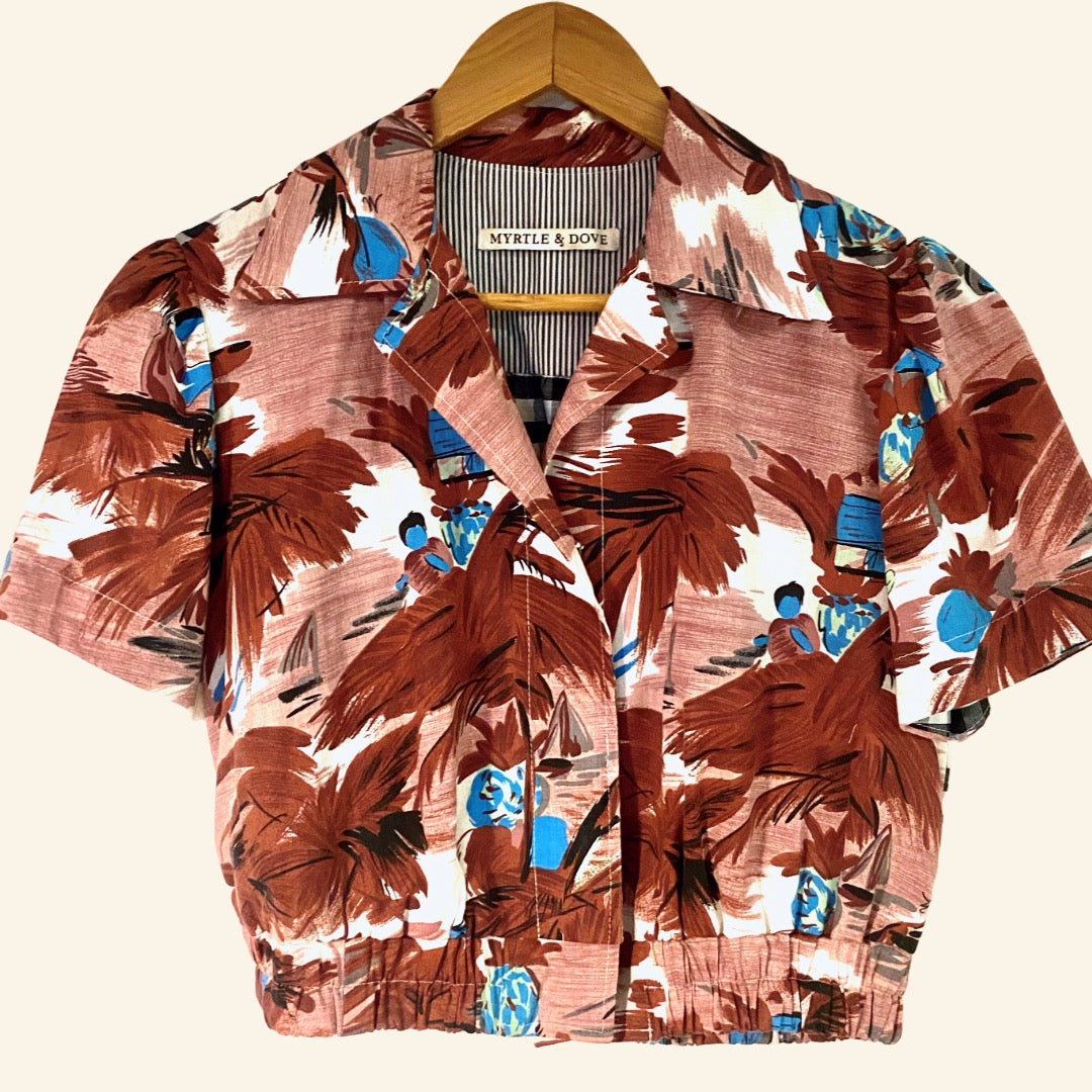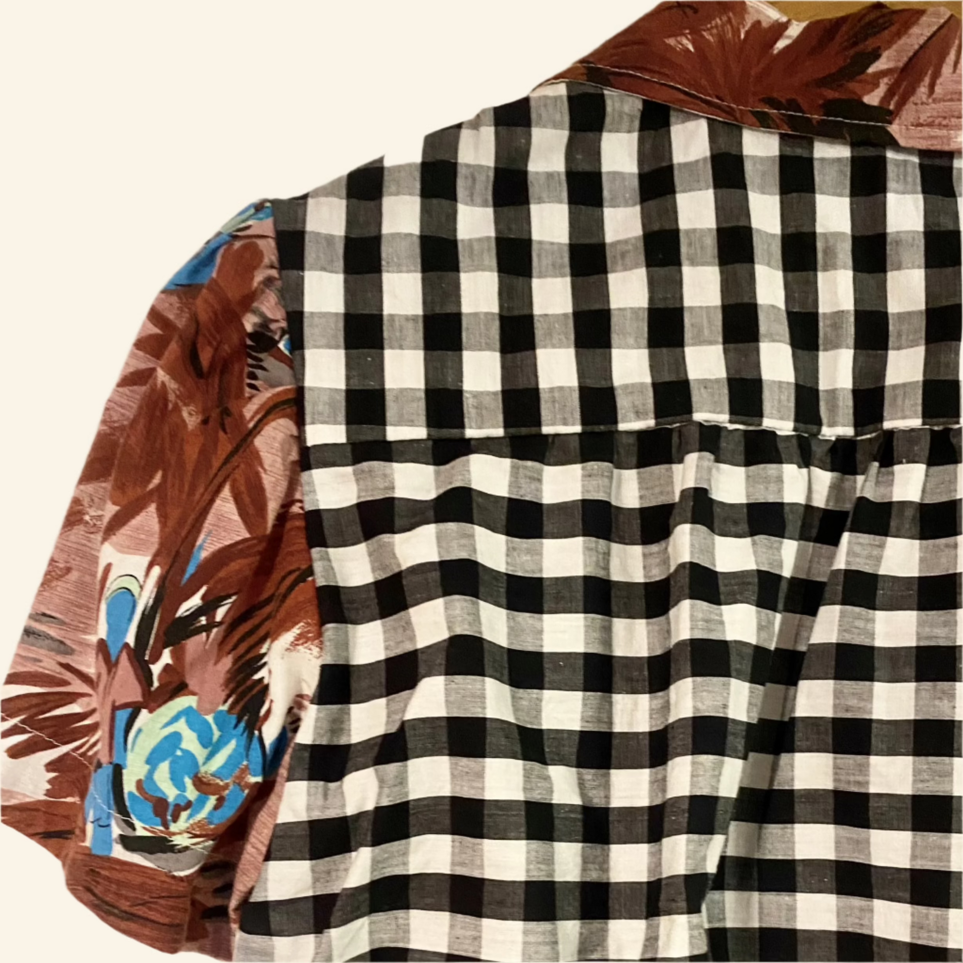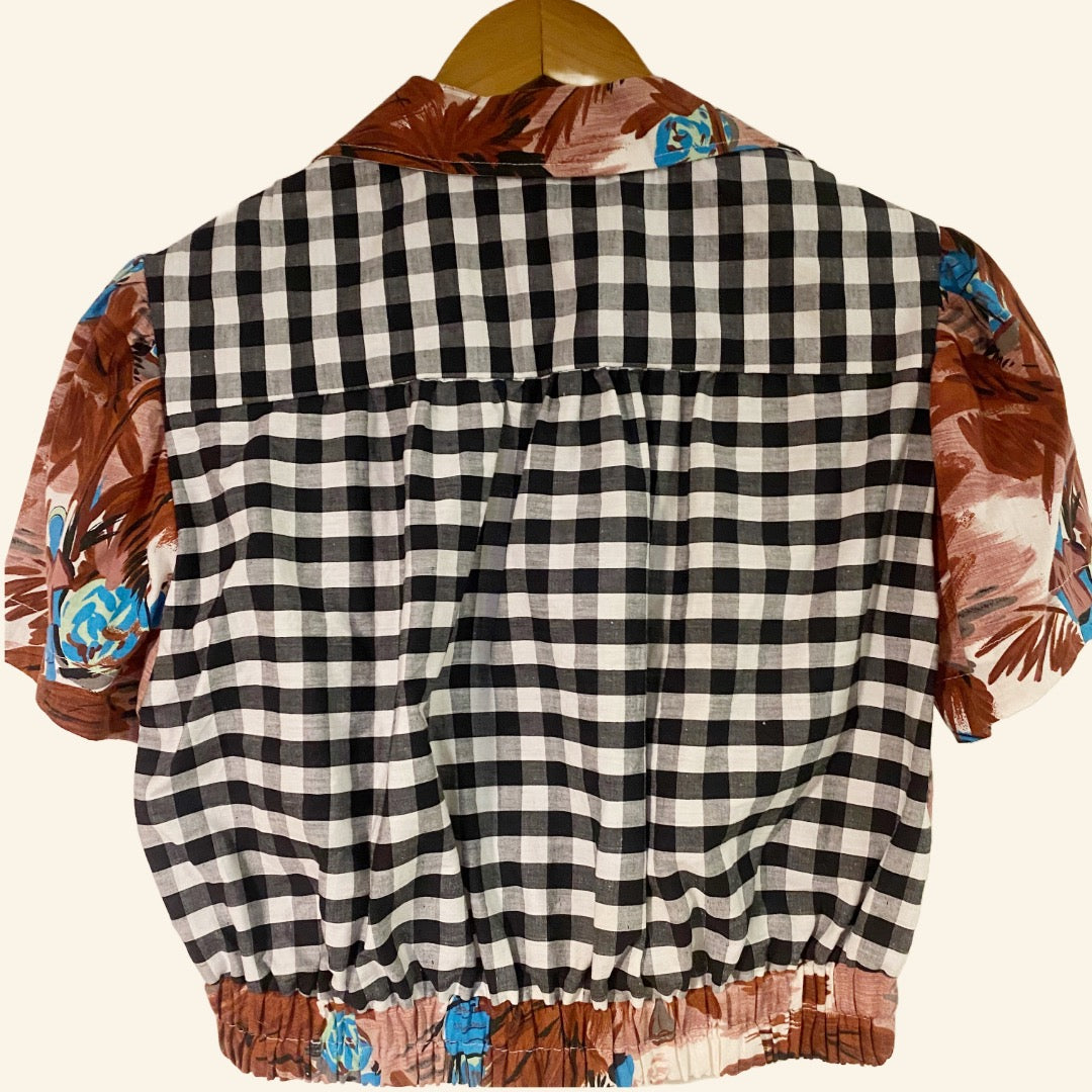 The Holiday One + Only Jacket! Made from vintage cotton fabric in rust brown and turquoise blue islander print, paired with a black and white gingham check.