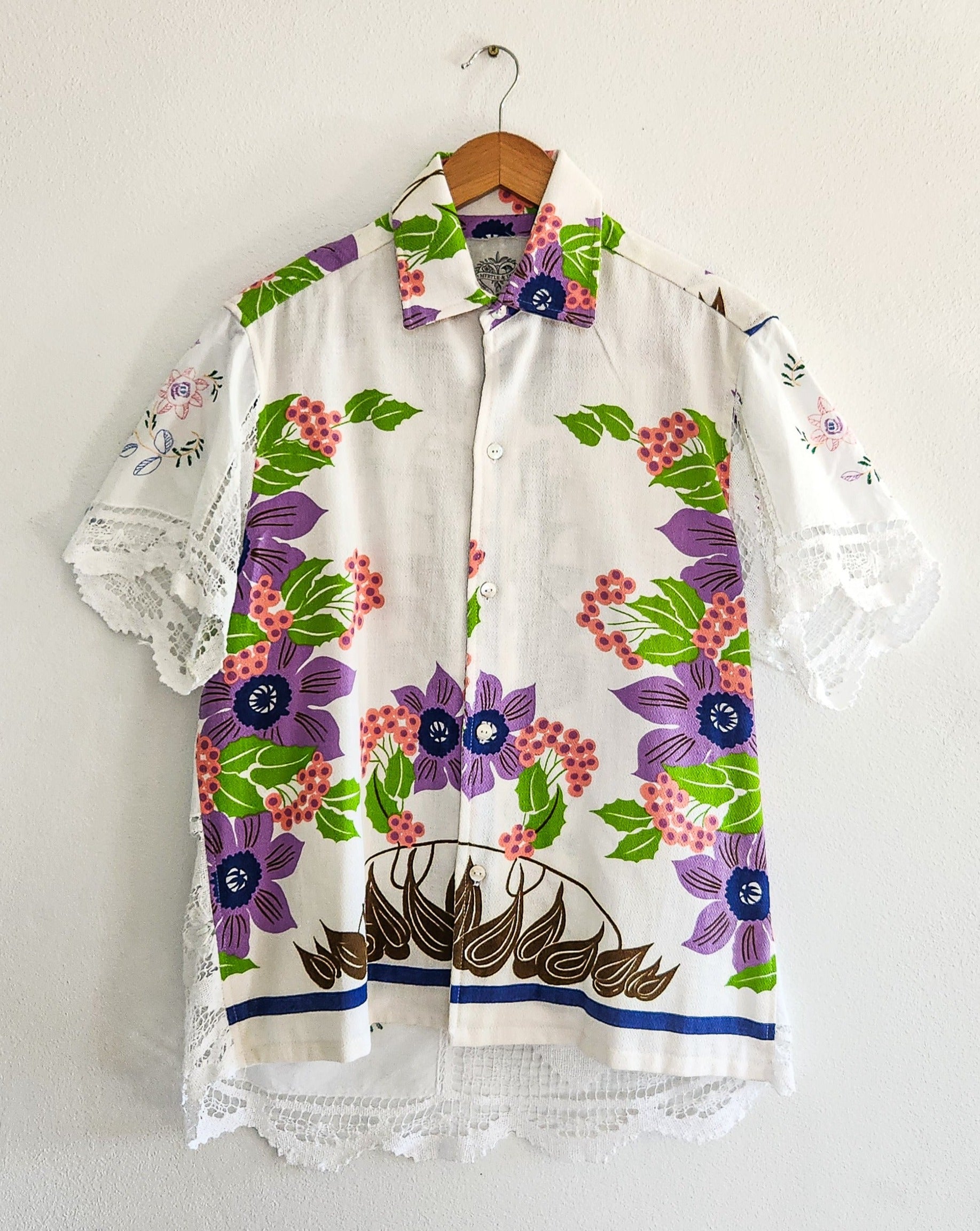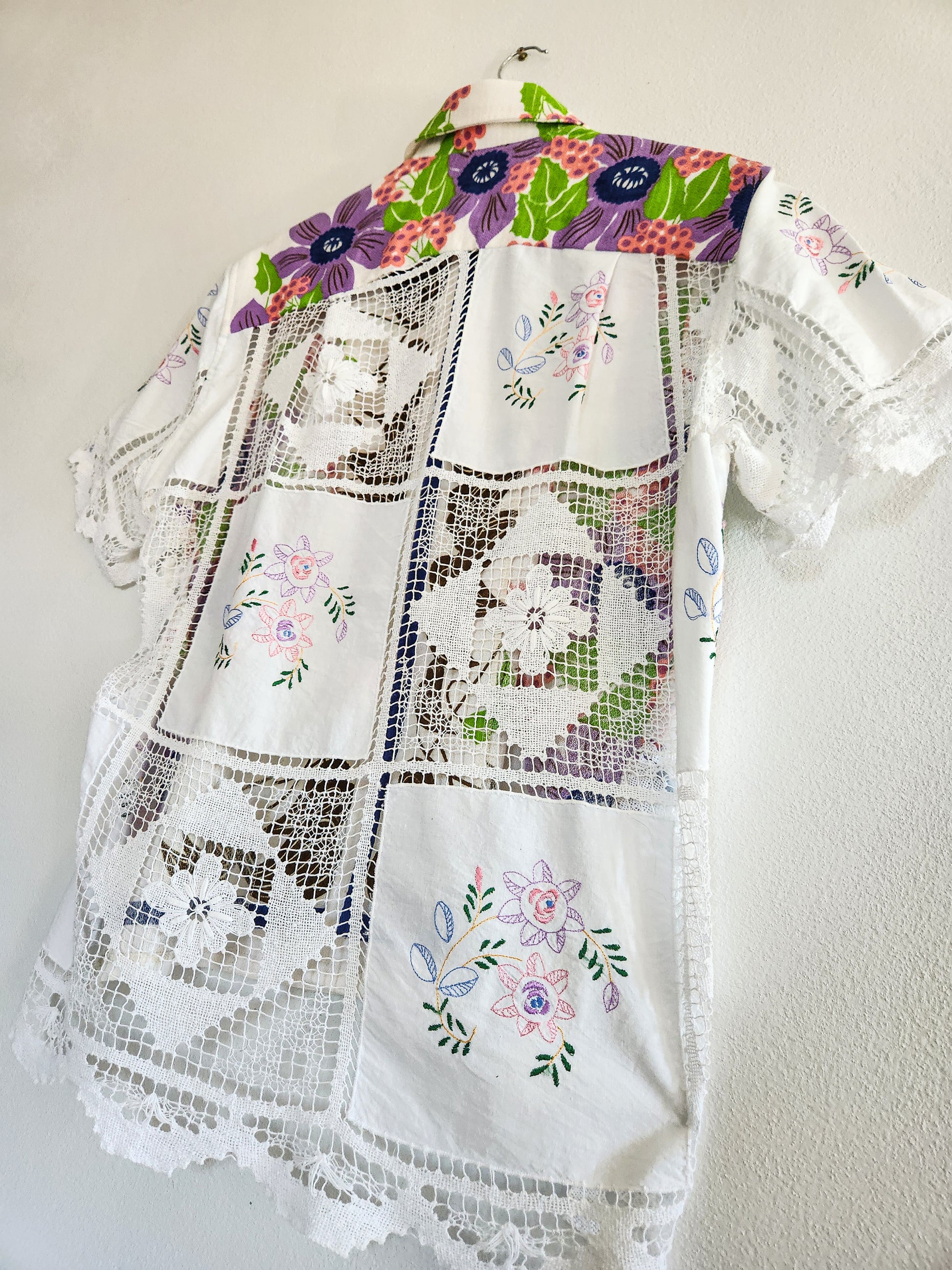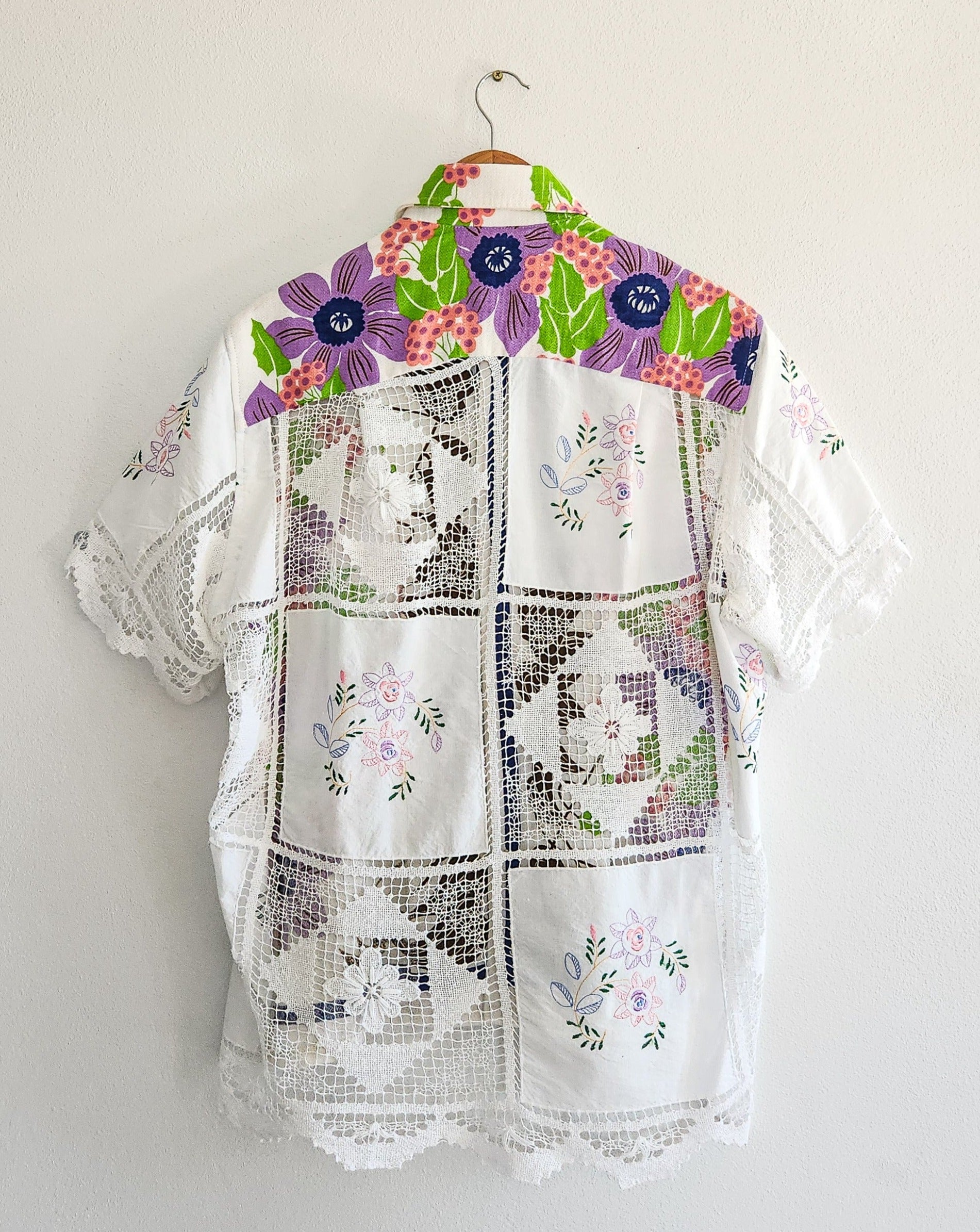 This shirt is crafted with a unique blend of vintage materials: A 100% cotton printed supper cloth featuring a vine of purple, blue and pink flowers teamed a table cloth that is a patchwork of tuscan lace and a simple floral embroidered cotton . Perfect for the vintage look you desire...🧵