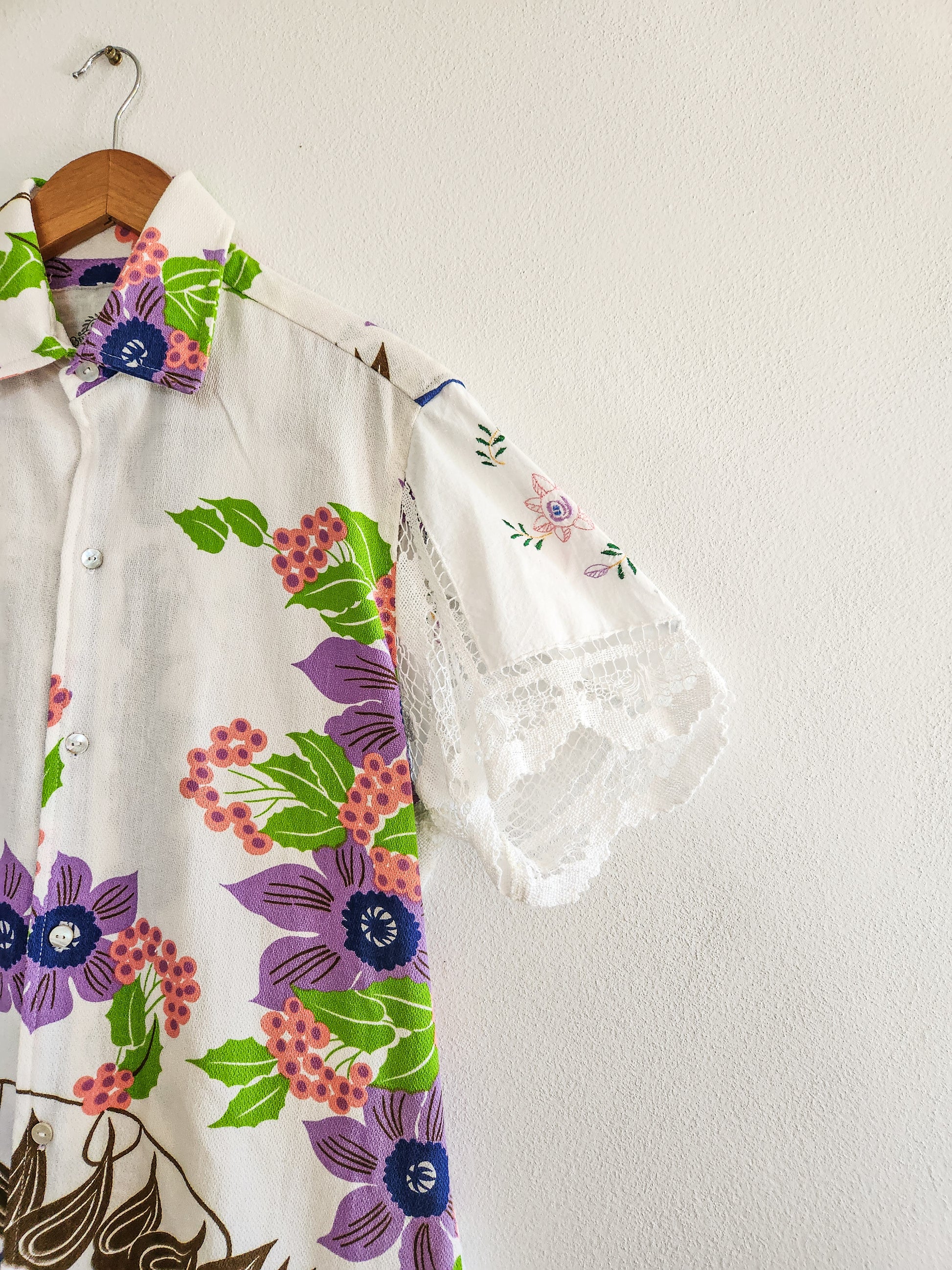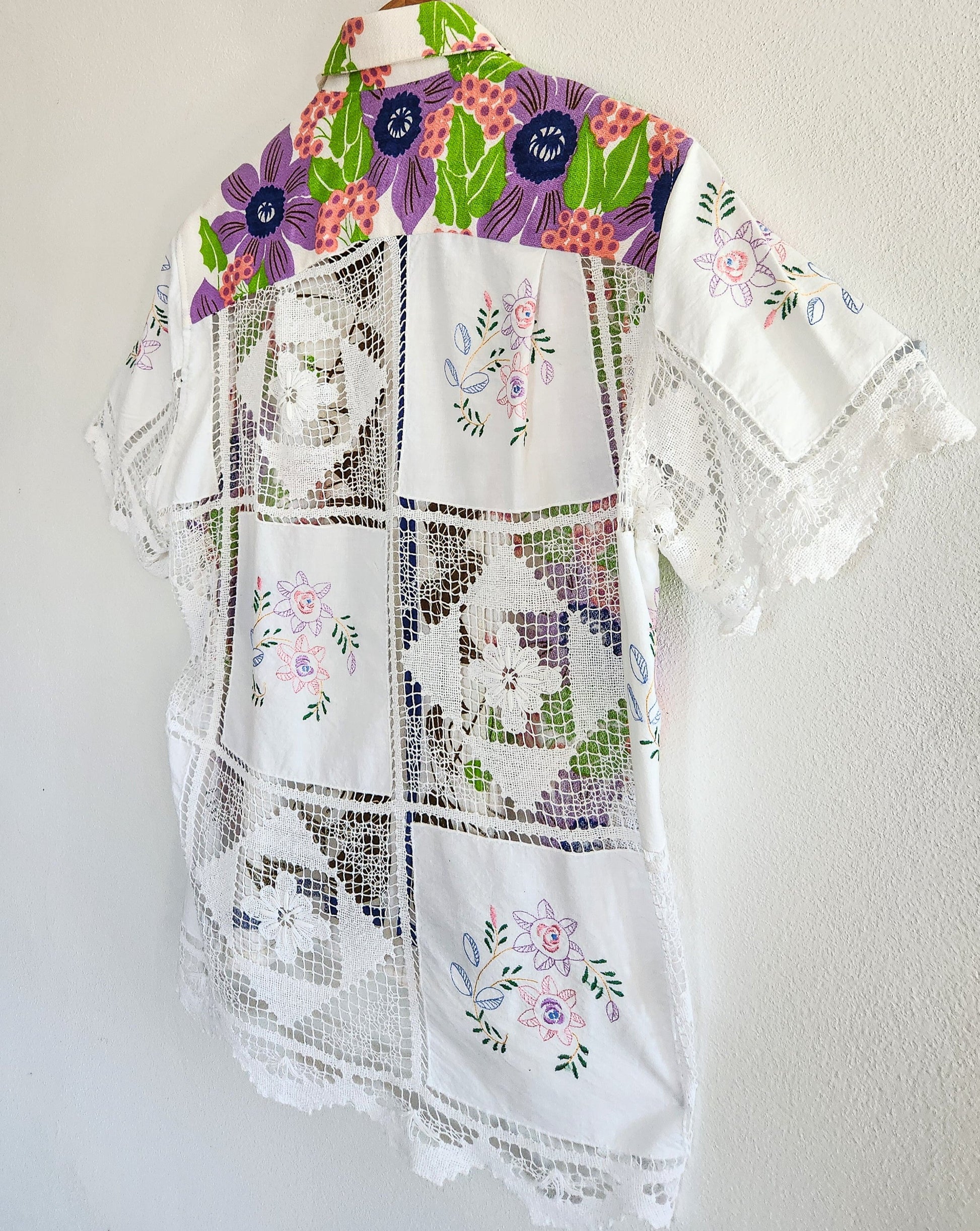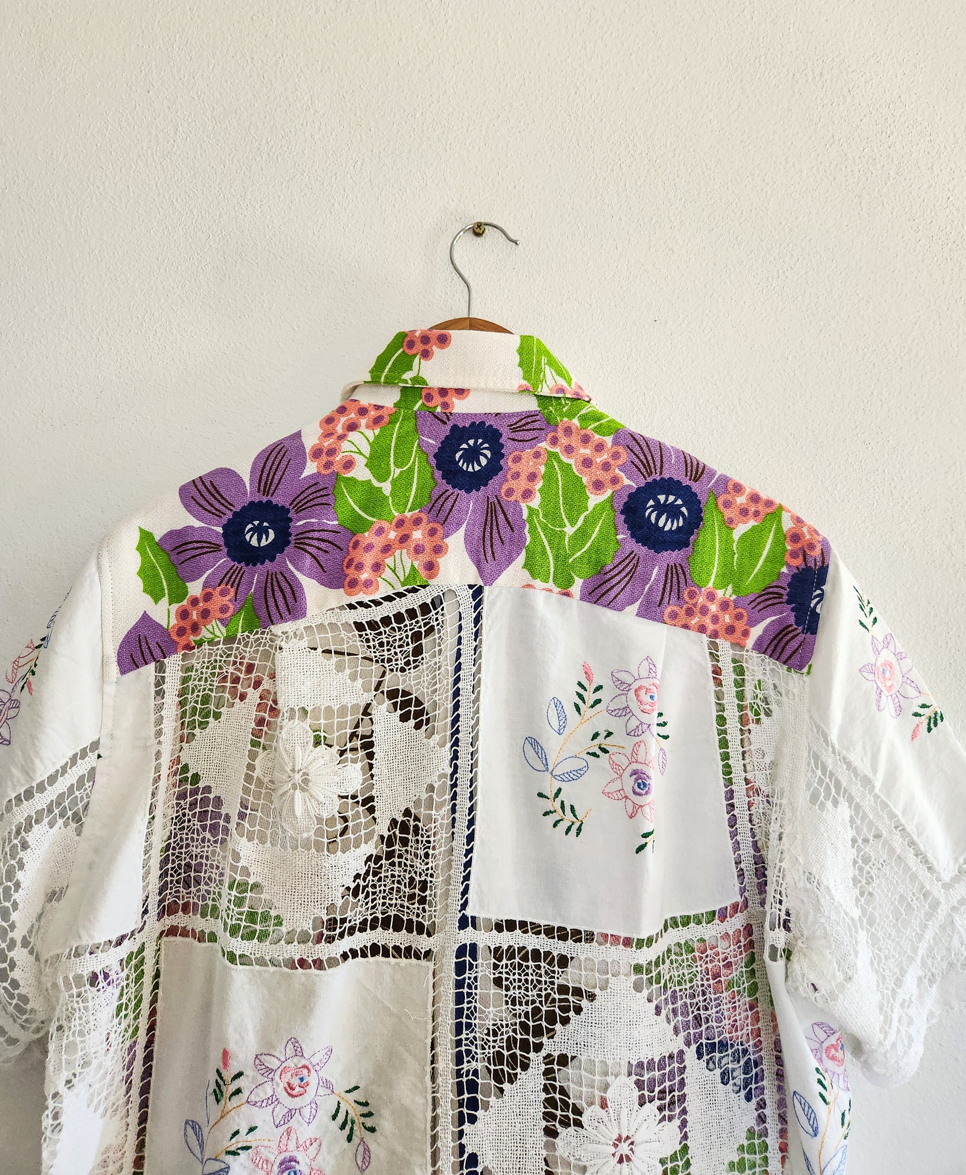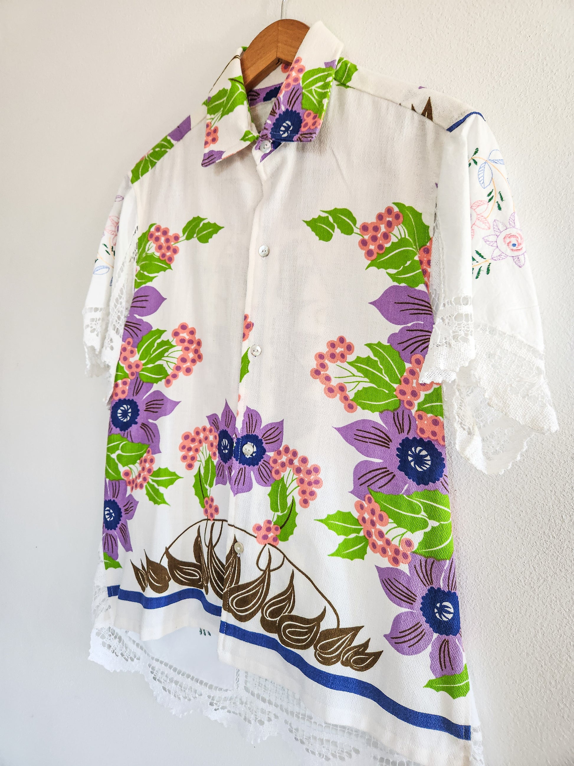 This shirt is crafted with a unique blend of vintage materials: A 100% cotton printed supper cloth featuring a vine of purple, blue and pink flowers teamed a table cloth that is a patchwork of tuscan lace and a simple floral embroidered cotton . Perfect for the vintage look you desire...🧵