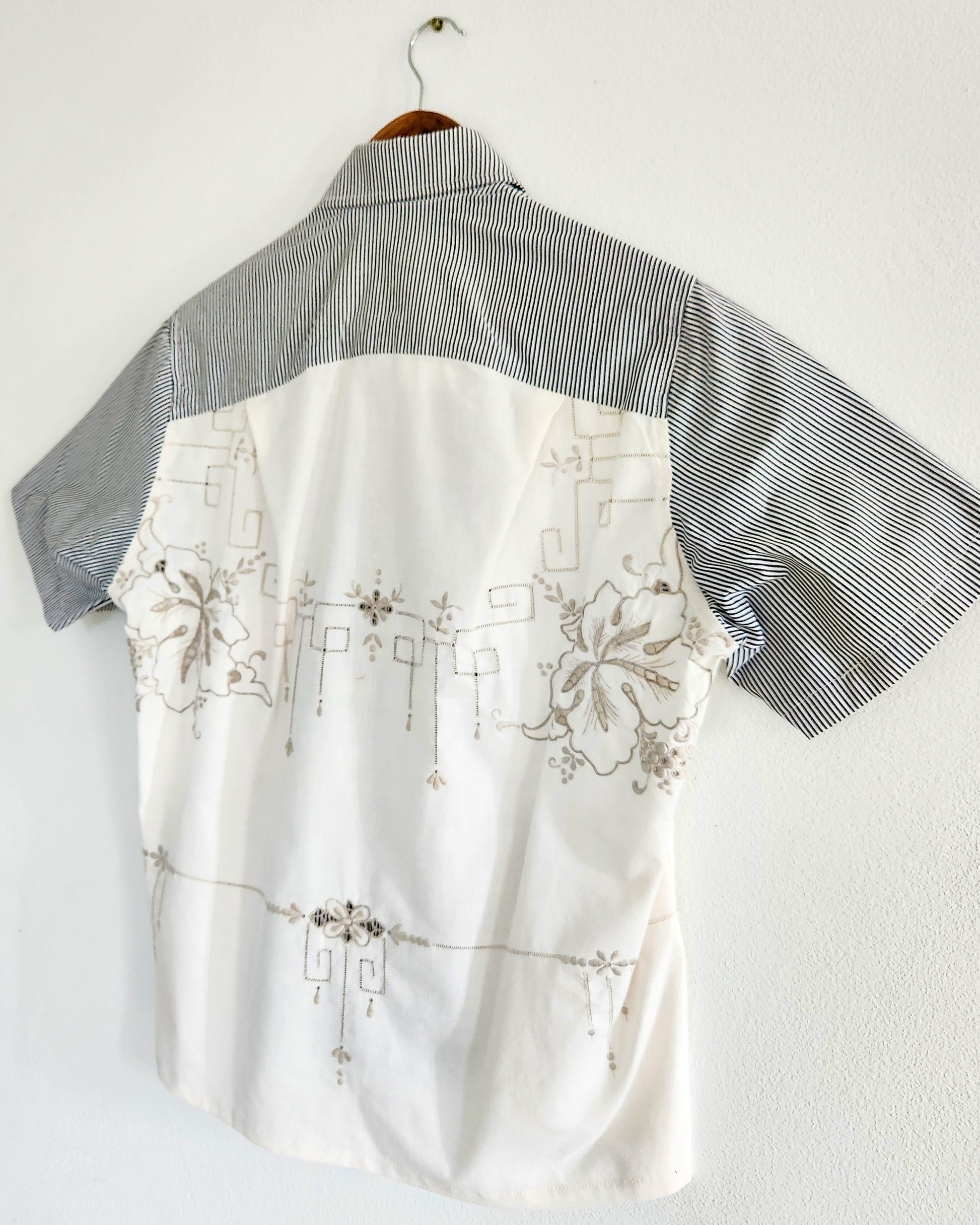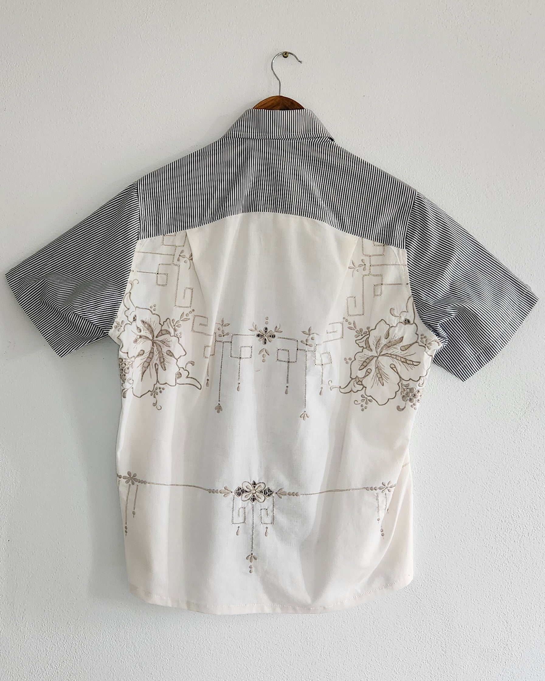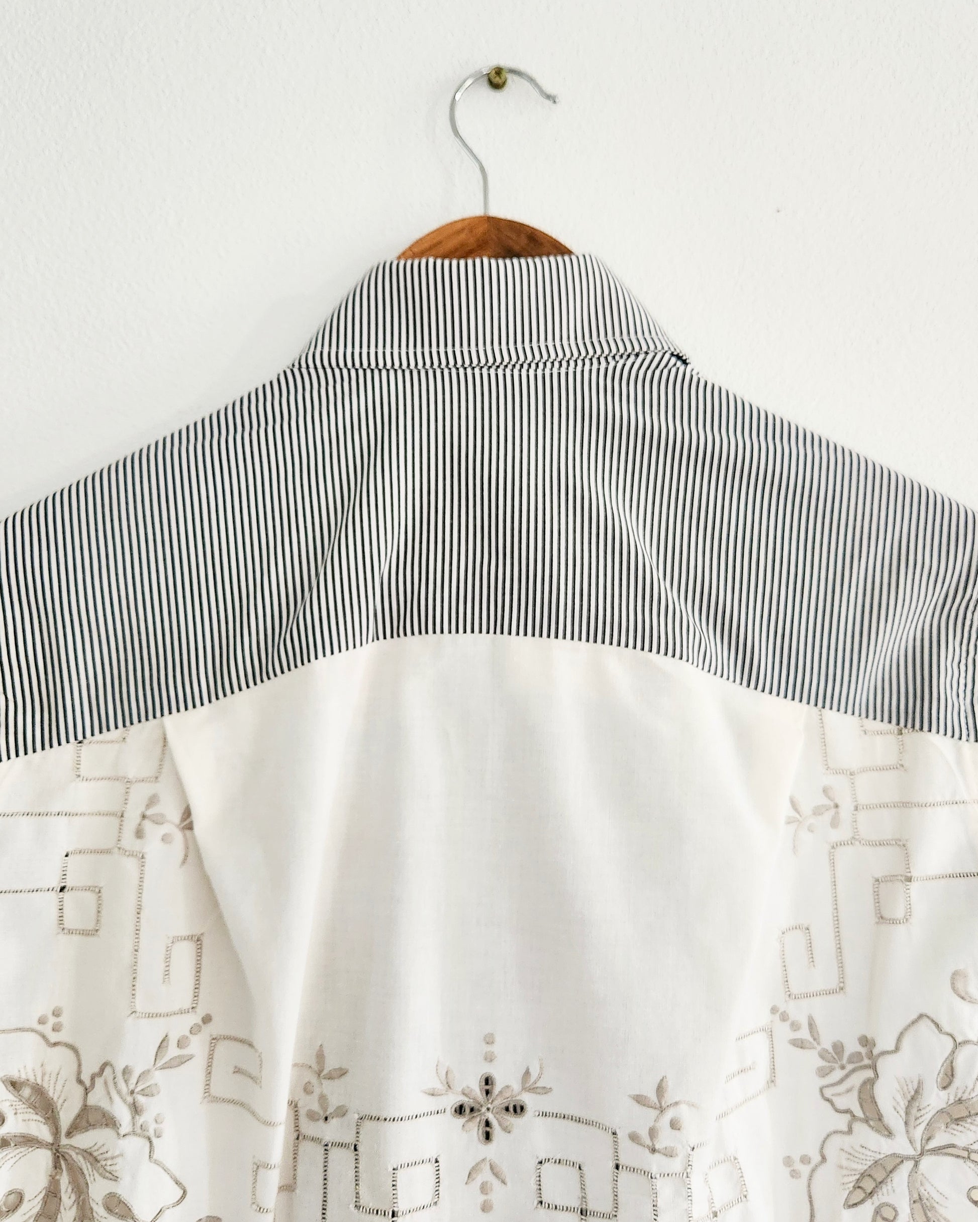 This shirt is made from a combination of black and white striped cotton and an embroidered linen table cloth in ecru and grey tones. 🧵