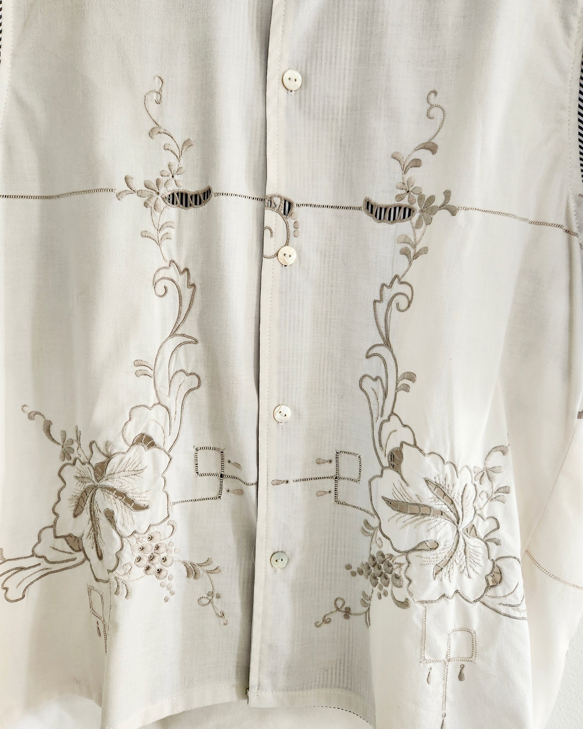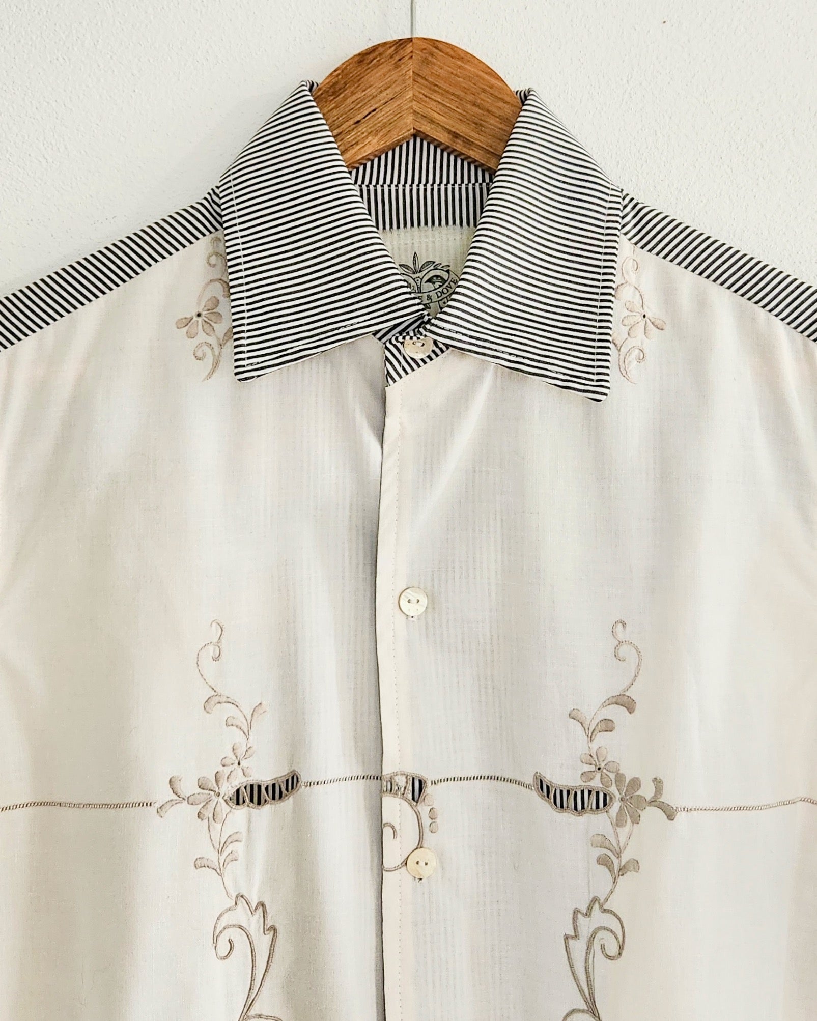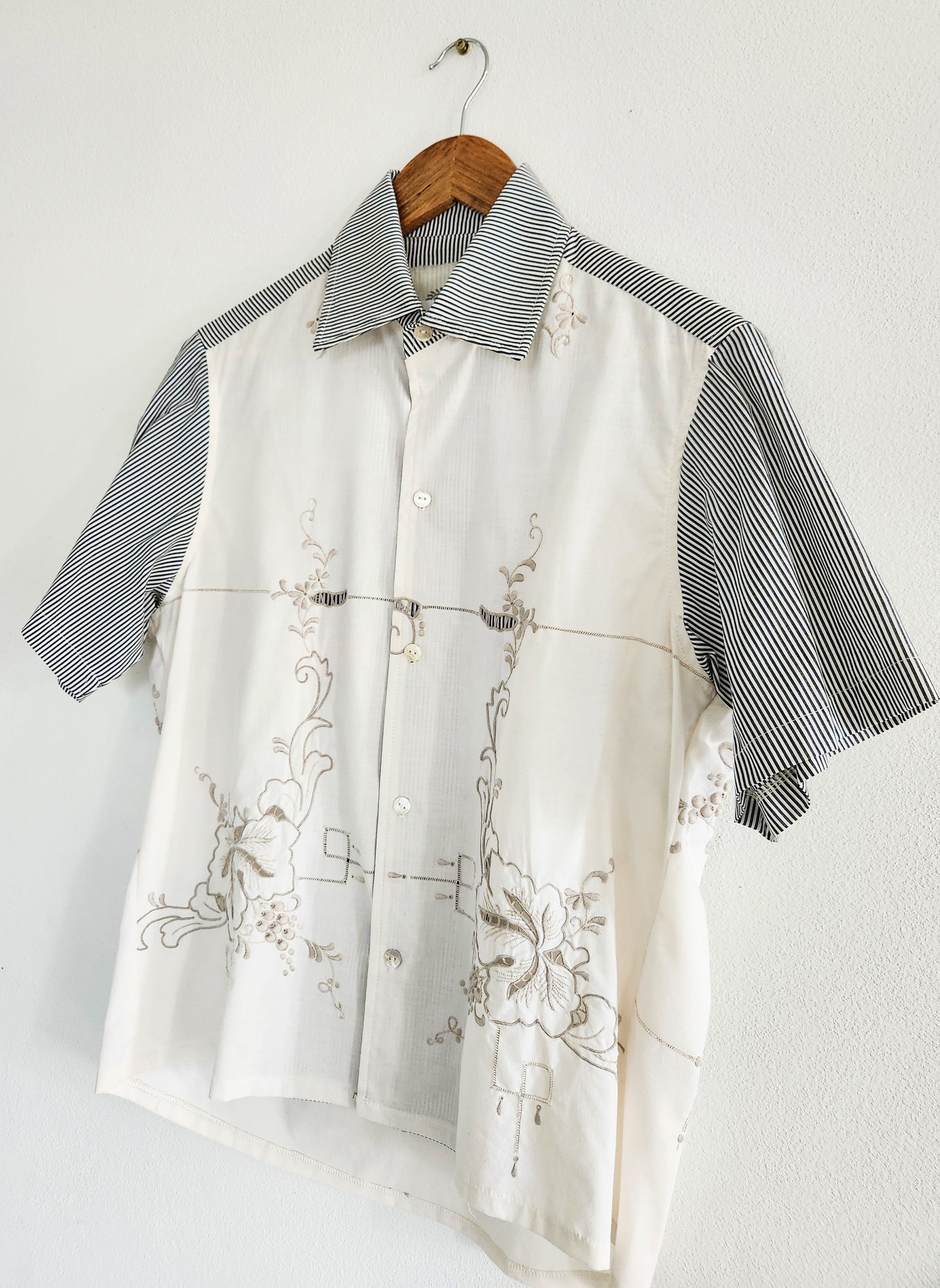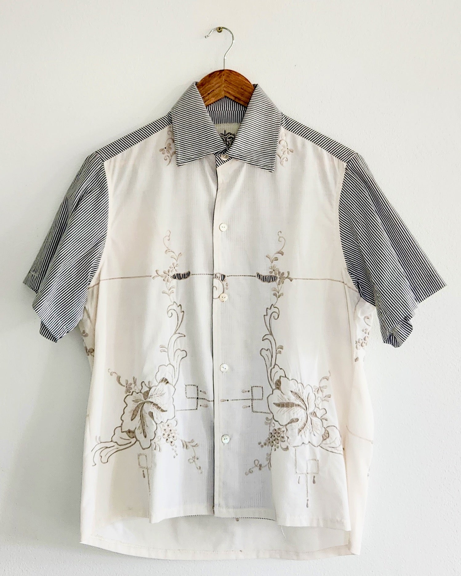 This shirt is made from a combination of black and white striped cotton and an embroidered linen table cloth in ecru and grey tones. 🧵