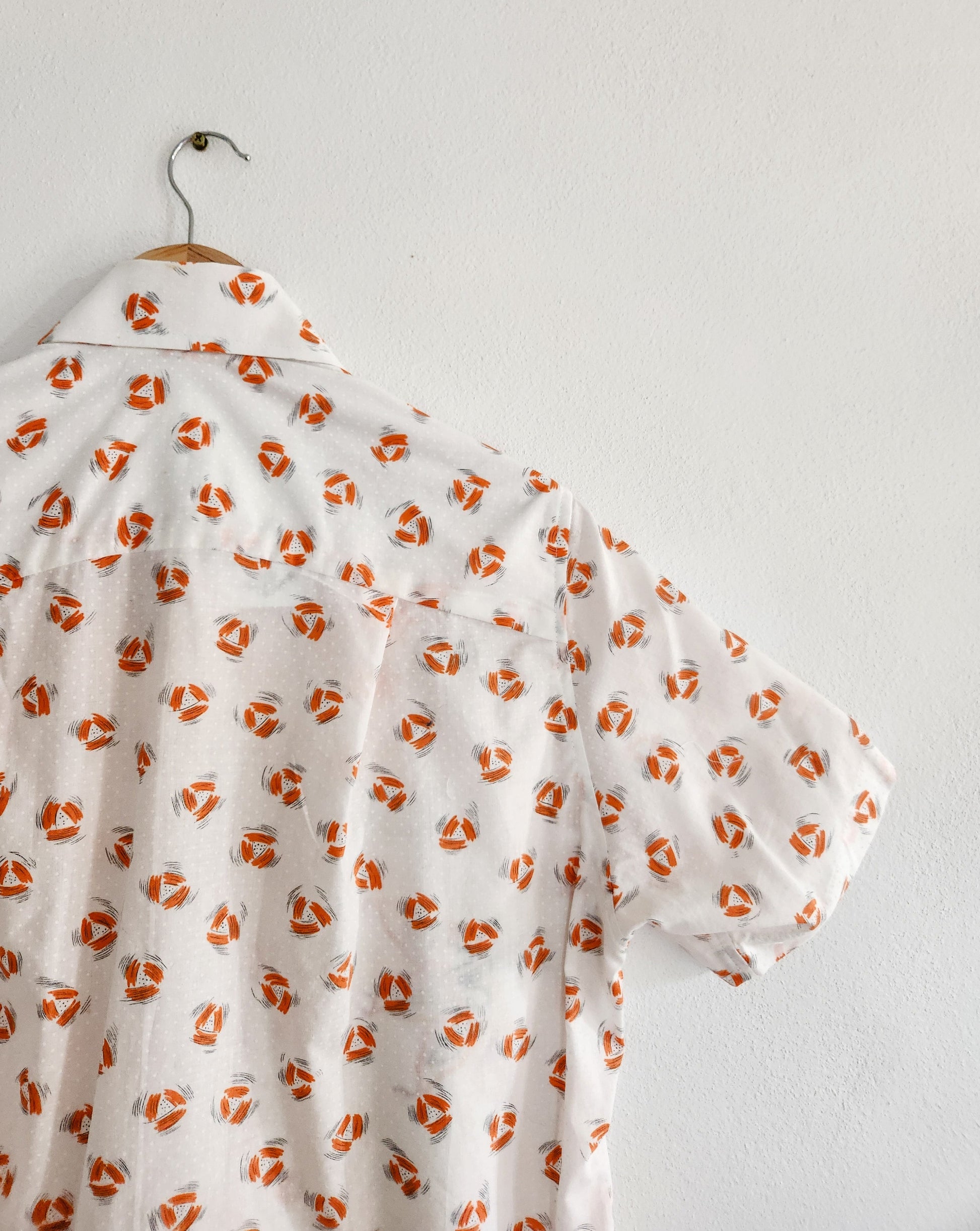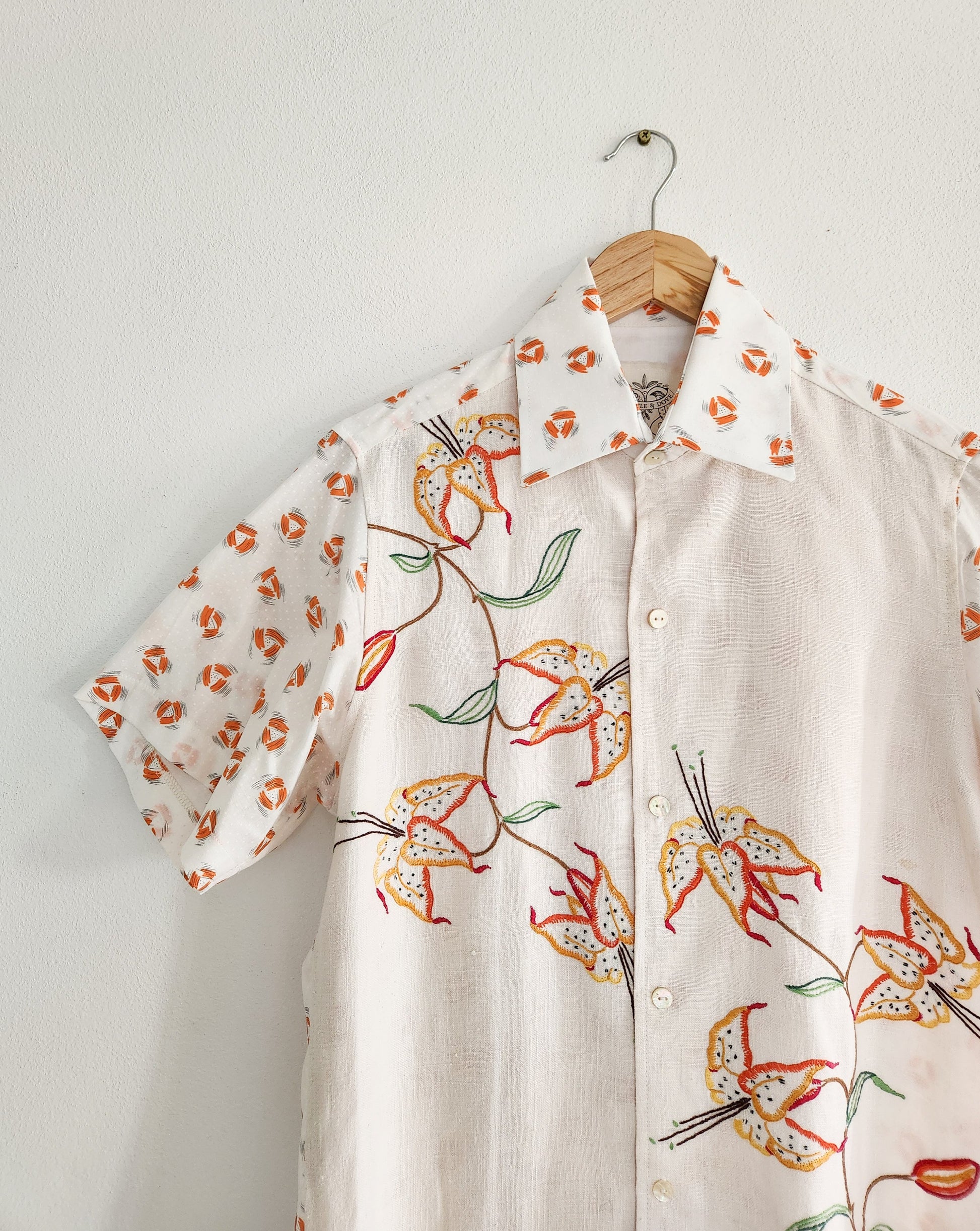 This shirt features a vintage 100% linen table cloth that has been hand embroidered with pretty orange tiger lilies, paired with a retro geometric cotton print..🧵