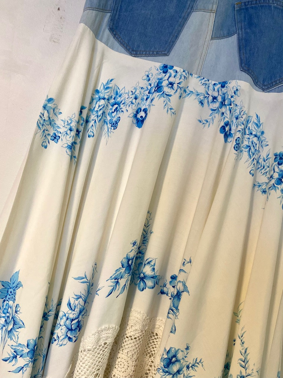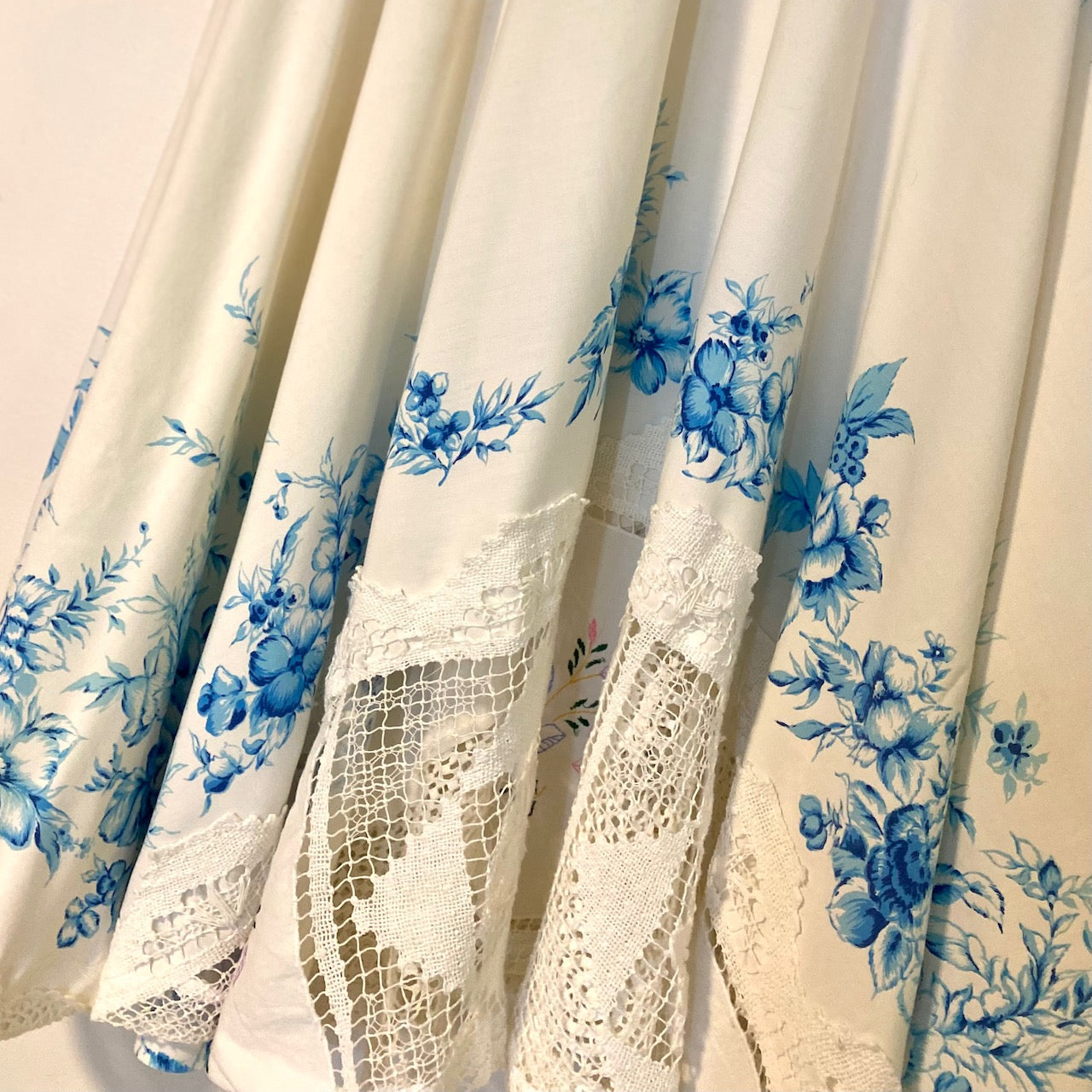 The lower full circle skirt features a mix of blue floral and white rayon tablecloth fabric, accented with delicate white crocheted and lace cotton tablecloths infused with subtle pink touches. The outcome is a unique, romantic garment that will become a cherished and timeless addition to your wardrobe.